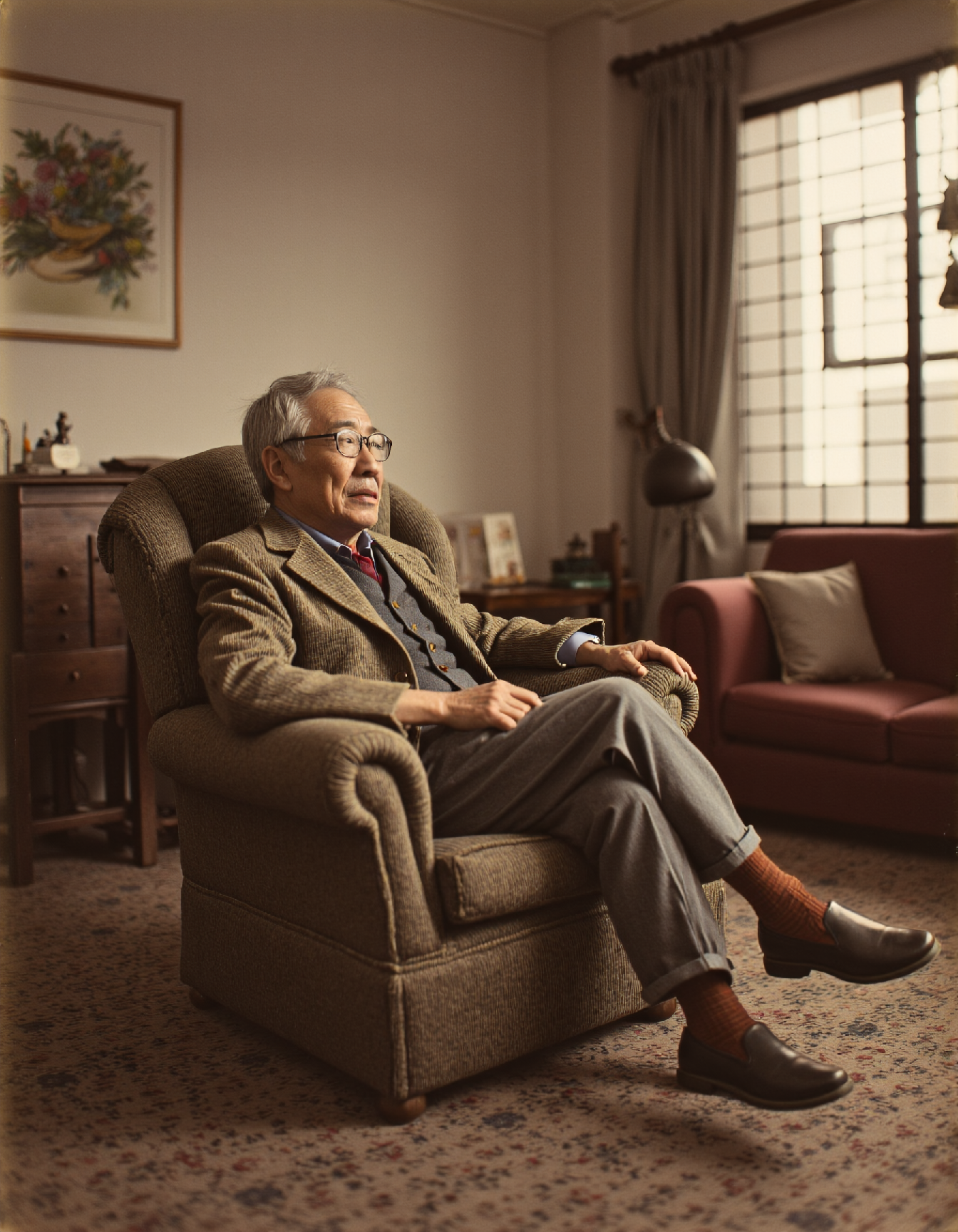 OldJapan style photo of an old man sitting in an armchair in a cozy living room