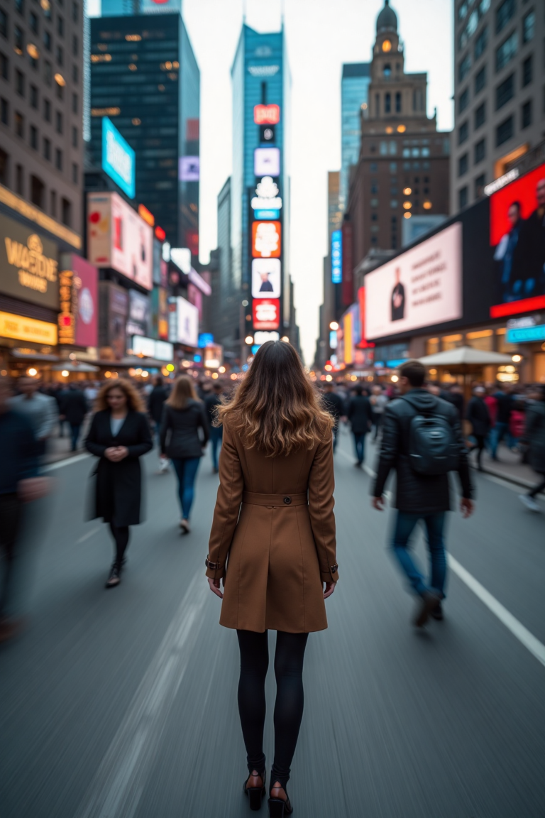 A long exposure photograph captures a beautiful woman standing still in a city, while around people are moving and appear blurred because of the long exposure. The background of city buildings remains sharp and clear, unaffected by the motion blur that follows the moving humans path. Long exposure photography with slow shutter speed creates intentional motion blur against a crisp background.