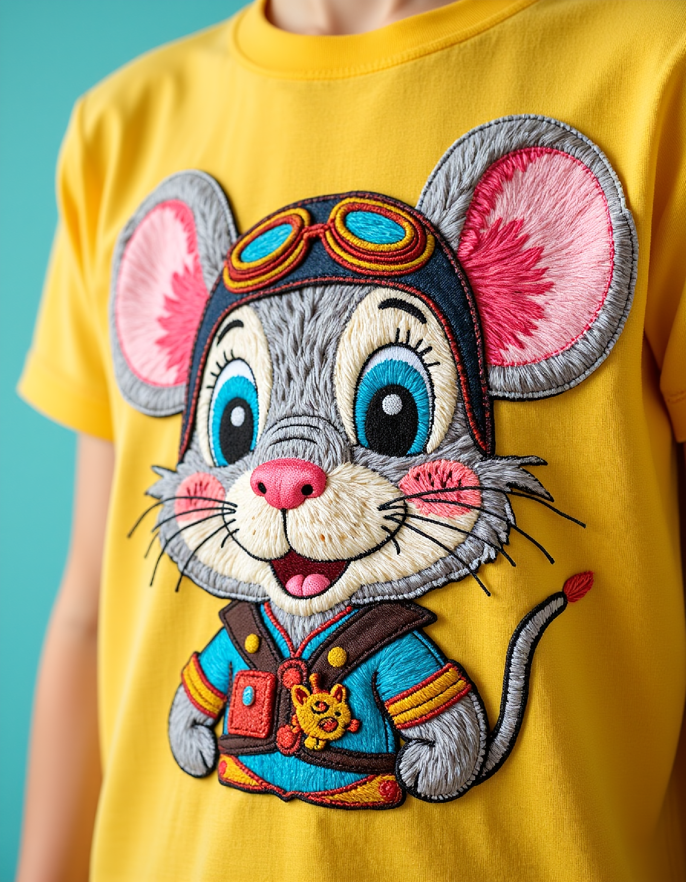 aplqueCE_style. a t-shirt with a colorful applique of a cute mouse pilot wearing aviator goggles.