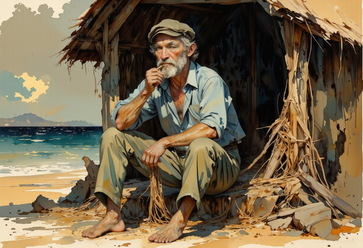 score_9, score_8_up, score_7_up, 8k high quality digital painting, masterpiece, very detailed, ultra realistic, (best quality) very detailed epic masterpiece, we see an old sailor sitting in front of his hut by the sea with a pipe in his mouth and tying a fishing net, he looks dreamily out at the sea, which shines colorfully in the sunset, romantic, sensual atmosphere, melancholic, watercolor, water colors, the edges blend into the white of the paper, realistic, realism, full body