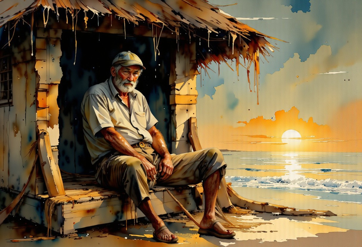score_9, score_8_up, score_7_up, 8k high quality digital painting, masterpiece, very detailed, ultra realistic, (best quality) very detailed epic masterpiece, we see an old sailor sitting in front of his hut by the sea with a pipe in his mouth and tying a fishing net, he looks dreamily out at the sea, which shines colorfully in the sunset, romantic, sensual atmosphere, melancholic, watercolor, water colors, the edges blend into the white of the paper, realistic, realism, full body