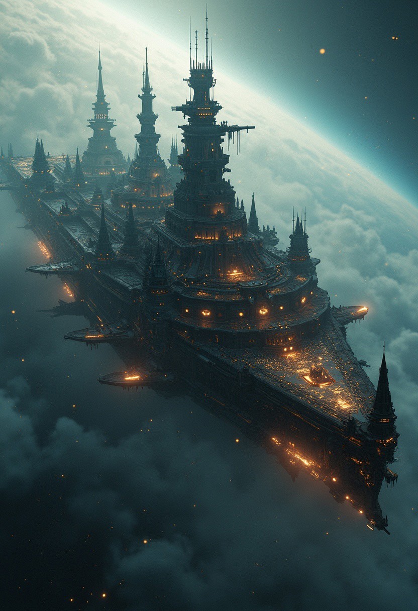 Masterpiece, ultra-realistic, 32k, best quality, hyper-detailed, cinematic lighting, reversal film photography, film grain, intricate textures, photorealistic, dramatic composition, immersive depth, trending on ArtStation.) (A colossal space battle cruiser drifts silently through the vast interstellar void, its gothic-mechanical architecture an awe-inspiring fusion of sci-fi and medieval grandeur. Byzantine palace-cathedral elements dominate its structure, towering spires reaching skyward, adorned with fluttering banners that ripple against the cosmic expanse.) (cybernetic decay woven into its divine yet eerie design. Embers drift weightlessly in the solemn silence, a haunting echo of forgotten wars and ancient faith.) (A dynamic wide-angle shot, with volumetric lighting, deep atmospheric contrast, and high cinematic tension, evoking a sense of solemn reverence and otherworldly power.)
