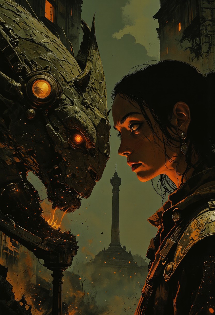 aidmaimageupgrader, aman0ayam1, Mangaka style, A high-quality digital painting featuring a close-up of a woman face to face with a dragon. The woman has sharp, defined features, piercing eyes locked with the dragon’s gaze, strands of wind-blown hair framing her face. She wears a weathered leather cloak with ornate embroidery, a metal shoulder guard reflecting ambient light. The dragon's colossal head dominates the frame, textured scales glistening, deep-set eyes radiating ancient intelligence, its breath subtly misting the air between them. Behind them, blurred ruins of a forgotten temple emerge in soft focus, fragments of stone pillars and overgrown vines adding history and scale. Warm, cinematic backlighting silhouettes both figures, catching particles of dust in the air. The mood is tense yet intimate, charged with silent power and mutual respect. Every detail is meticulously rendered — the rough texture of the dragon’s scales, the softness of the woman’s skin, the subtle reflections in their eyes. Rich, dark color palette of stone grey, ember orange, and deep forest green. Ultra-realistic, 8K quality, volumetric lighting, depth of field, R-ESRGAN 4x+, score_9.