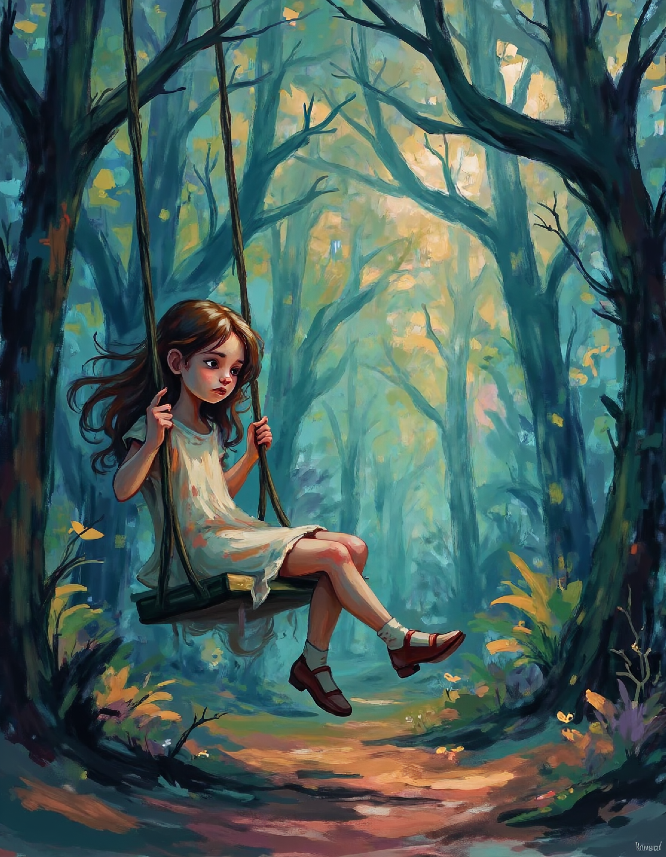 ssf_4bstr4ct painting of a sad girl sitting on a swing in a dark creepy forest