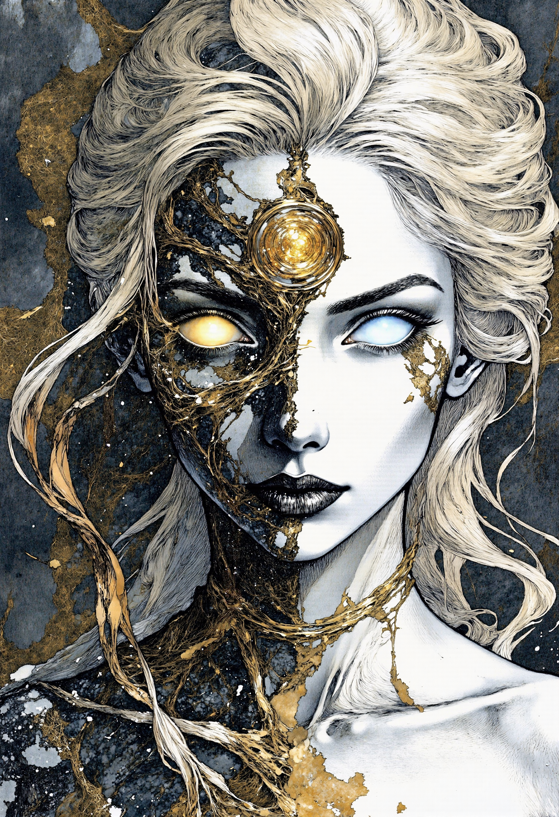 fg, A portrait of Hel, the ruler of Helheim. Her marvelous wild mane covers part of her beautiful face and bare chest. Both eyeballs are completely blank and featureless, devoid of pupils and irises, and extend across the entire eye region, blending seamlessly into the surrounding facial area, while the eyes remain fully open. The face is divided into two halves. The left side shows signs of decay and decomposition, with lifeless dark-coal skin, hard bones are visible under the torn skin, shreds of golden ash detached from her skin. Her left eyeball is completely golden. The right half of the face is of unearthly beauty, with immaculate, flawless white skin. Her right eyeball is completely snow-white. The transition between the two halves of the face is fluid and unobtrusive, symbolizing the brief moment between life and death. The picture showcases a surreal and abstract style, created using pencil and ink, characterized by a monochromatic scheme with predominant shades of black, white, and gray, which has been digitally enhanced.