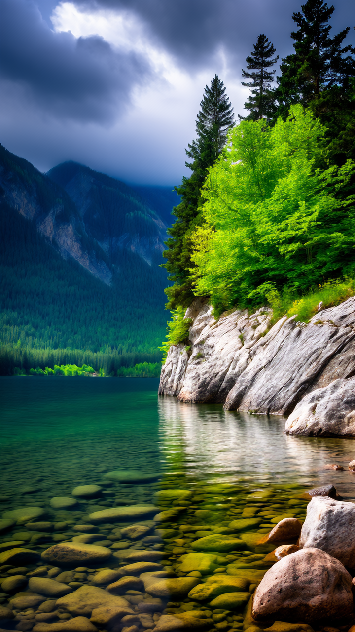 The image depicts a serene and picturesque natural landscape. In the foreground, there is a calm body of water, likely a lake, with clear, reflective water that reveals the pebbles and rocks along the shoreline. The shore is lined with smooth, rounded stones of various sizes, creating a natural and rugged edge to the water. To the right of the image, there is a steep, rocky, white granite, cliff face covered in lush green vegetation. The cliff is composed of light-colored rock with patches of moss and small shrubs clinging to its surface. The greenery includes a mix of coniferous trees, which are tall and dense, and some deciduous trees with bright green leaves, indicating a vibrant and thriving ecosystem. In the background, the landscape rises into towering mountains, partially shrouded in mist and clouds. The mountains are covered in dense forests, with the trees appearing dark green against the lighter, more distant peaks. The sky above is a mix of dark, stormy clouds and patches of blue sky, suggesting that the weather might be changing or that it has recently cleared up. Overall, the image captures the beauty and tranquility of a natural lakeside setting, surrounded by dense forests and majestic mountains.
