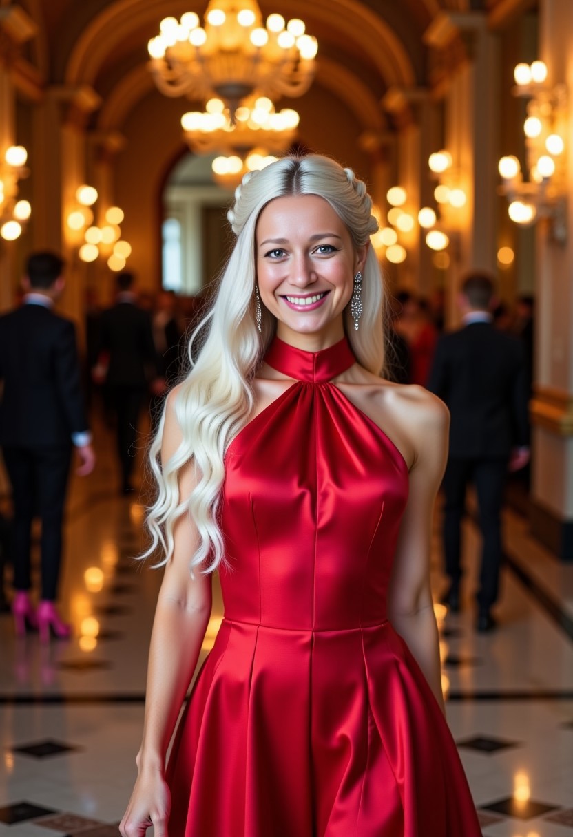 Lizalove, beautiful woman. NSFW Masterpiece. Long white Malvinka hair with plaits and plaits from the central strands, realistic charming blue eyes, medium-sized breasts. clo016, wearing a sleek red satin gown with a high halterneck design, figure-hugging silhouette flowing to the floor, styled with statement earrings and pink heels. She with a captivating smile that reveals her perfectly aligned teeth looks directly at the viewer. She is in a grand Regency-era ballroom, characterized by high, arched ceilings with ornate chandeliers casting a warm, golden glow. The walls are adorned with intricate moldings and large mirrors, reflecting the light and the elegance of the gathering. The floor is lined with polished marble, excellent lighting of the hall. The atmosphere is one of luxury and sophistication, capturing the splendor of the era. 8K HD, DSLR camera, high quality, detailed texture skin, high body detail, realistic, soft focus, insanely detailed, highest quality, high resolution photography, realistic photo, ultra detailed, hyperrealism