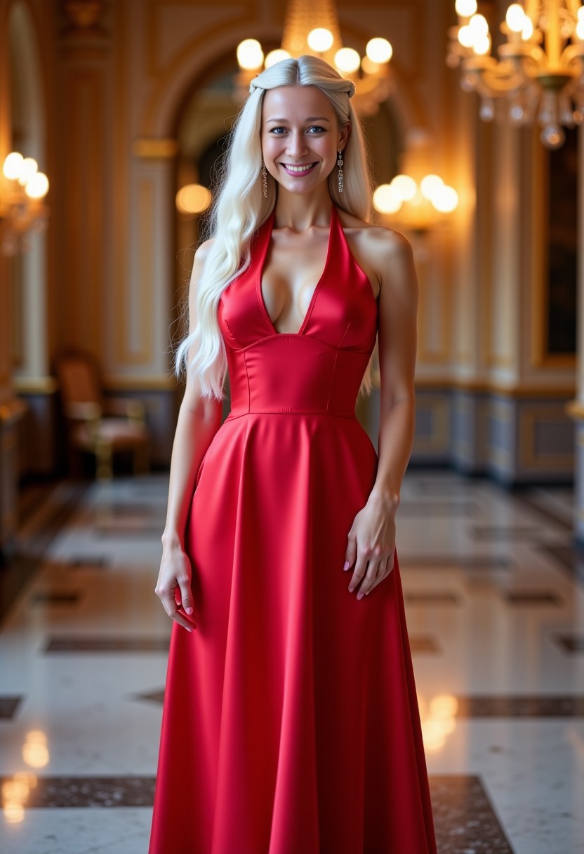 Lizalove, beautiful woman. NSFW Masterpiece. Long white Malvinka hair with plaits and plaits from the central strands, realistic charming blue eyes, medium-sized breasts. clo016, wearing a sleek red satin gown with a high halterneck design, figure-hugging silhouette flowing to the floor, styled with statement earrings and pink heels. She with a captivating smile that reveals her perfectly aligned teeth looks directly at the viewer. She is in a grand Regency-era ballroom, characterized by high, arched ceilings with ornate chandeliers casting a warm, golden glow. The walls are adorned with intricate moldings and large mirrors, reflecting the light and the elegance of the gathering. The floor is lined with polished marble, excellent lighting of the hall. The atmosphere is one of luxury and sophistication, capturing the splendor of the era. 8K HD, DSLR camera, high quality, detailed texture skin, high body detail, realistic, soft focus, insanely detailed, highest quality, high resolution photography, realistic photo, ultra detailed, hyperrealism