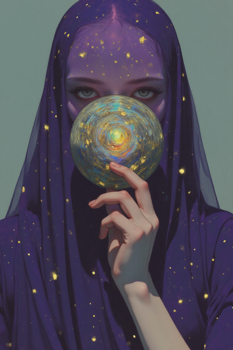 (8k, cinematic, Highly detailed hyper-realistic pencil drawing illustration, ArsMJStyle, Colored pencil hyperdetailed realism) A digitally created artwork blending surrealism and fantasy. The central figure is a person of indeterminate gender with light skin and a neutral expression. They are draped in a flowing deep violet veil that covers most of their face and shoulders. The veil has a smooth, silk-like texture, cascading in soft folds, adding mystery and quiet elegance. At the center of the veil is a large, luminous, intricate celestial object resembling a radiant planet or star. This celestial body glows in shifting hues of iridescent blue, violet, and gold, speckled with countless tiny shimmering silver stars, creating a mesmerizing, ethereal effect. The soft light radiating from the celestial sphere bathes the veil in subtle gradients of cool blue and purple tones, enhancing depth and dimension. The background is a solid, desaturated teal-gray, providing contrast while maintaining focus on the figure and the celestial element. The overall style is highly detailed and realistic, emphasizing the delicate balance between natural beauty and supernatural presence. The composition evokes a sense of cosmic wonder and enigmatic grace within a surreal, dreamlike atmosphere.
