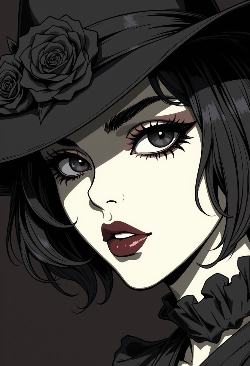 A close-up portrait of a mysterious Gothic woman's face, rendered in a Manga Sketch style with bold, clear lines. She wears a wide-brimmed black hat adorned with black roses, which casts a soft shadow over part of her face. Her pale skin is accentuated by dramatic, defined dark eye makeup and deep crimson lips. Her expressive eyes and enigmatic expression add to her allure. The drawing features crisp outlines and minimal shading, emphasizing the manga aesthetic, with a simple, dark background that keeps the focus on her striking features.