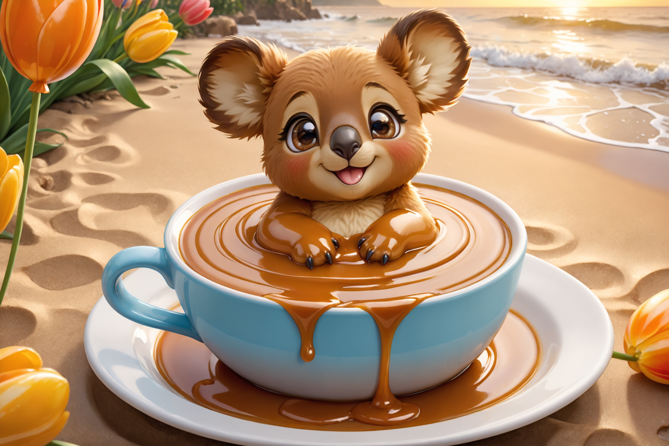 a tiny koala with round ears, clinging to a branch, caramel-toned fur with a glossy sheen, solo, caramel, caramel sauce, with caramel ripple fur, brown with golden ripples and a glossy texture, caramel, caramel sauce, giggly expression with caramel joy, eyes sparkling, cheeks puffed, caramel, caramel sauce, a flower garden with caramel tulips, butterflies with caramel wings, petals with caramel shimmer, detailed background, caramel, caramel sauce, tossing caramel balloons into the air, eyes sparkling, caramel balloons floating with shimmer, caramel, caramel sauce, cheerful, ears perked with caramel happiness, caramel, caramel sauce, environment focus, wide shot, a sunset beach play with animals building caramel sandcastles, caramel waves, caramel sunset beach, caramel, caramel sauce, a fluffy caramel pillow, resting on it, caramel, caramel sauce, on soft caramel straw, warm and cozy with caramel scent, caramel, caramel sauce, foggy with caramel haze, thick caramel mist swirling, dim visibility with caramel glow, caramel, caramel sauce, evening with orange and caramel sky, cooling air with caramel scent, soft caramel light, caramel, caramel sauce, best quality, vibrant colors, photorealistic style, high detail, high-definition, hyper-realistic, extremely high-resolution details, fine texture, incredibly lifelike, realistic, not cartoon, not drawing, highres, 4K resolution, source photo, realistic photo, masterpiece, best quality, amazing quality, very aesthetic, ultra-detailed, detailed textures, natural lighting, soft lighting, caramel, caramel sauce, caramel latte tones, light and frothy caramel shades with a gentle shine, caramel, caramel sauce, caramel moonlight, cool caramel silver glow, caramel, caramel sauce, high angle shot, looking down, <lora:caramel gmr lora:0.5>