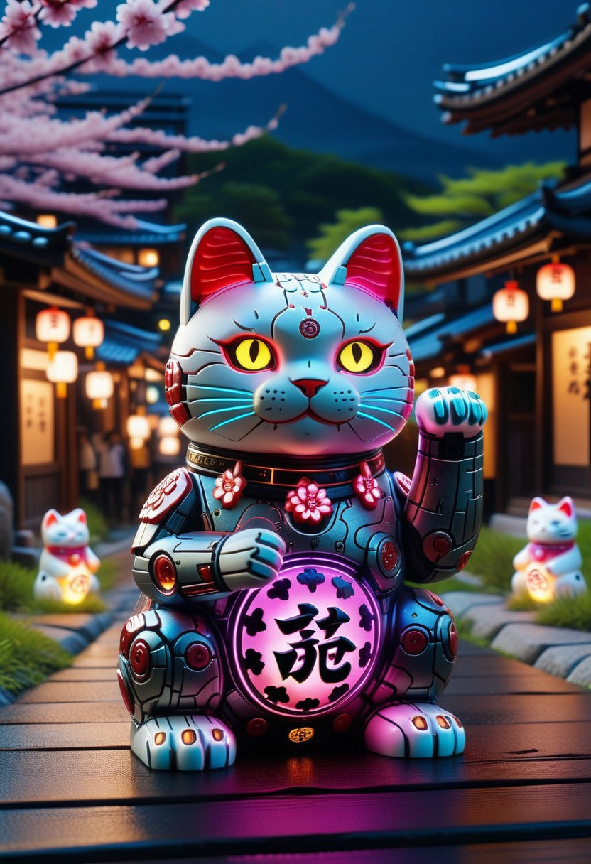 Cyborg, RGB light up Maneki-Neko, Japanese village background, Cherry blossoms, vibrant, photography, high quality, detailed, realistic