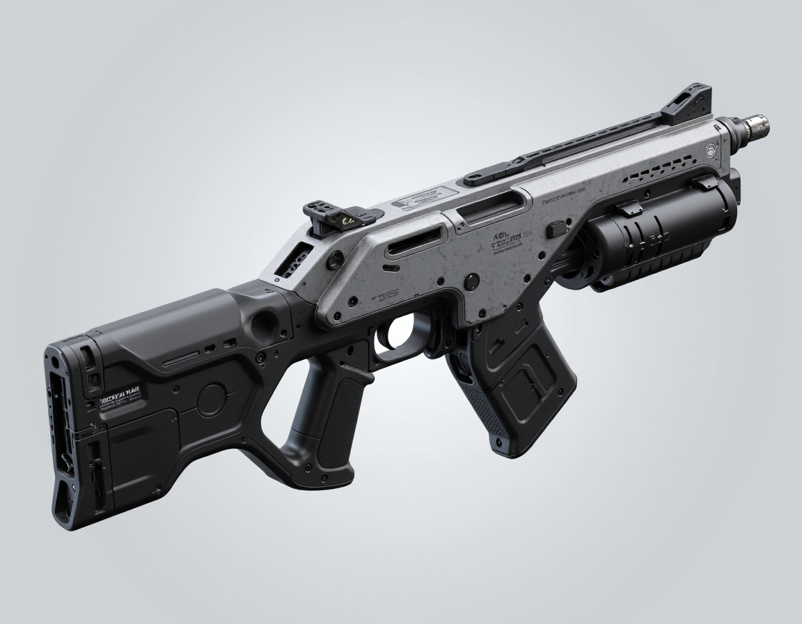 CYBER_CORE_UT,A highly detailed futuristic Submachine gun render, shown in close-up. The design is sleek, minimal, and industrial — blending sci-fi aesthetics with real-world ergonomics. Materials include brushed metal, matte black polymer, and precision-machined elements. The textures are flawless: smooth metal, slight wear, fine detailing in grips and mechanisms. Lighting is cinematic and perfectly balanced to emphasize form, edges, and reflections without overexposure. The background is simple, neutral, and unobtrusive — light grey or soft gradient — ensuring full focus remains on the weapon. Composition is centered and clean, ideal for showcasing design precision in a high-tech, conceptual art style.