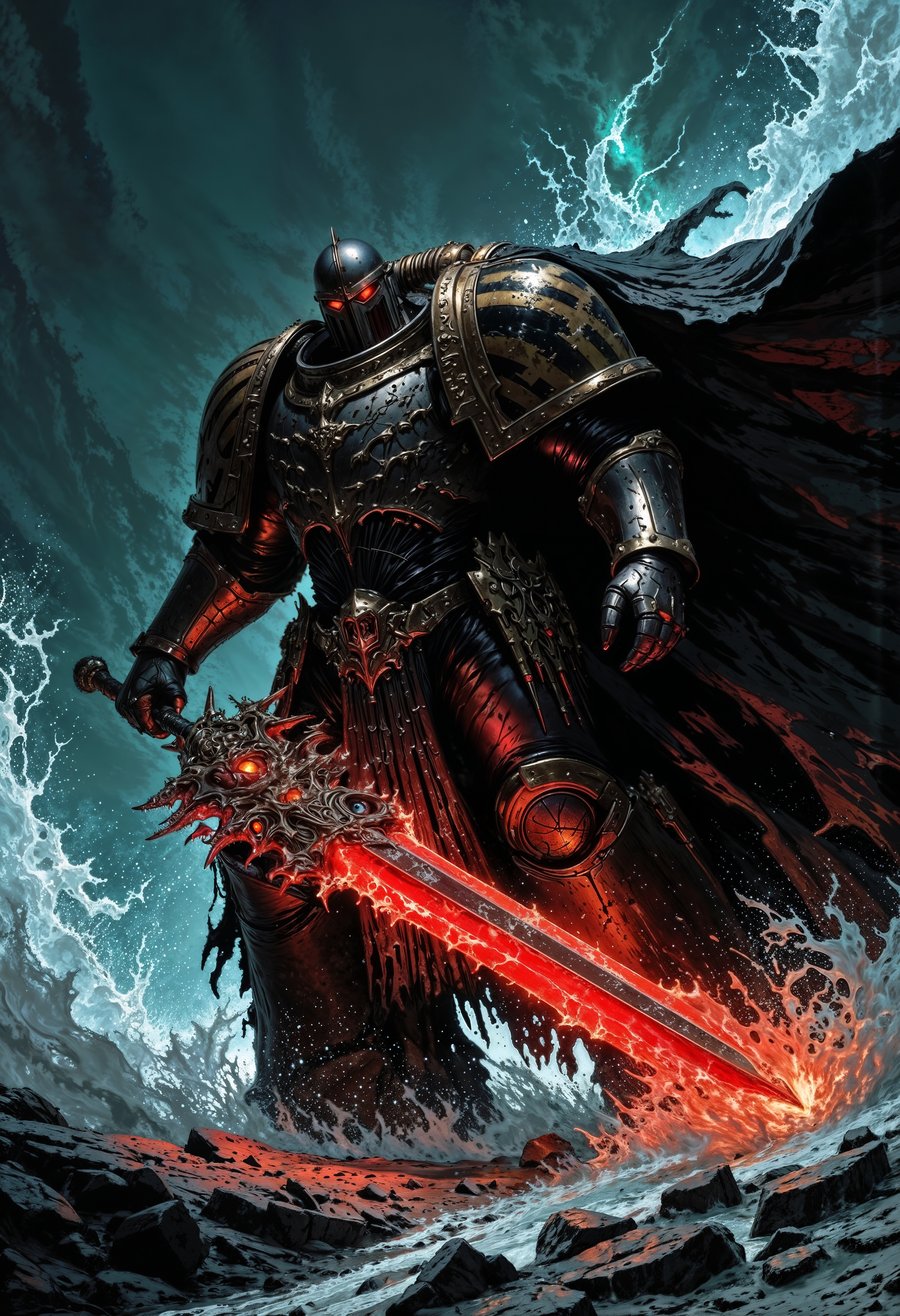 highly detailed magical cinematic scene, Dark, damaged and torn power armored figure with long cape wielding glowing colossal and long red sword amidst cascading water. two glowing magical eyes visible through his helmet. Powerful, dynamic pose engaging in a dramatic action scene. Figure shrouded in steal IronW40k power armor, exuding a mysterious and intense mood. The sword, vibrant turquoise, bursts with ethereal energy, radiating light through the water. Water splashes and sprays dramatically around the figure, creating a forceful and evocative mist-filled background. Mid-action portrayal; colossal sword held in motion with implied movement. Dramatic lighting highlights the figure and sword, emphasizing their presence and power. Water's texture suggests forceful motion, contrasted with smooth dark surface of figure's armor. Epic fantasy style, evocative of cinematic action sequences. Atmospheric and heroic feeling enhanced by the dark and dramatic lighting and water features; a strong sense of adventure and danger pervades the image, shallow depth of field, vignette, highly detailed, bokeh, moody, epic, gorgeous, film grain, grainy,