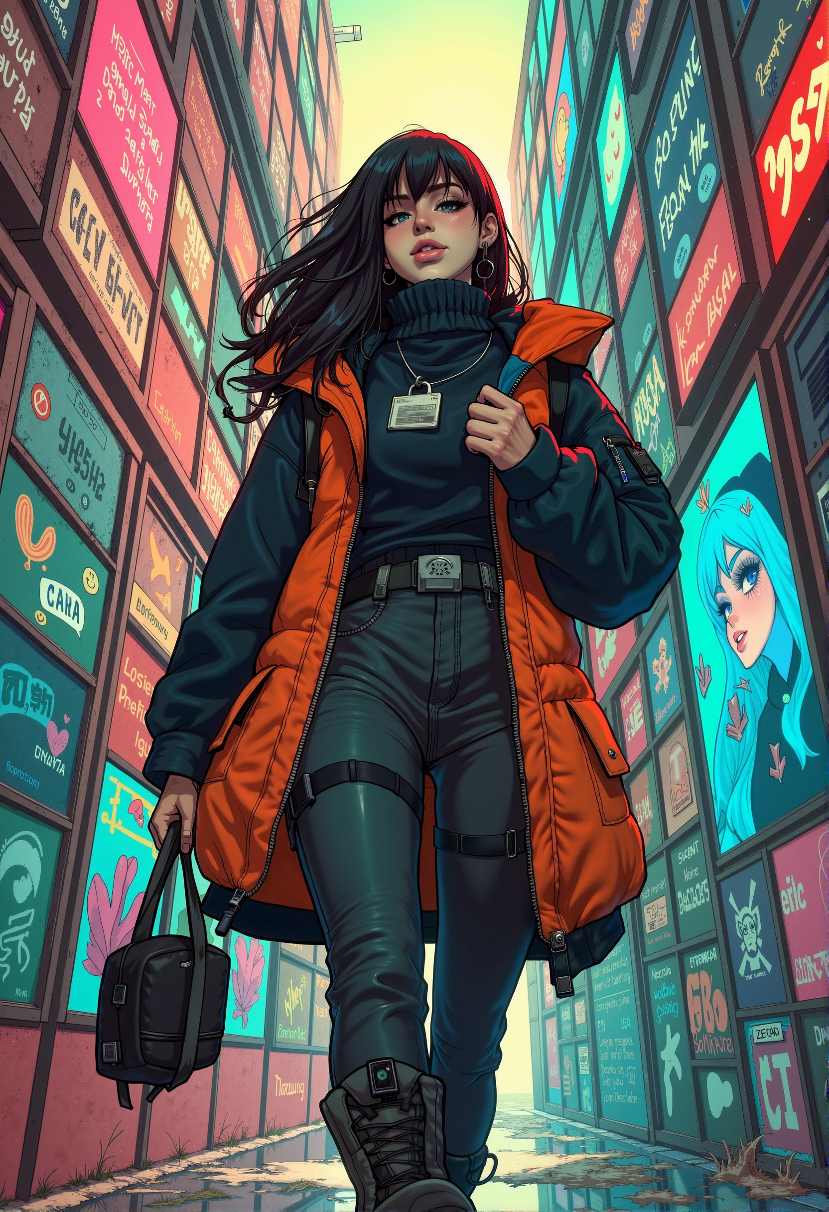 hyper-detailed, modernretroanime, aidmaDarkGothicAnime, Anime, thick lips, long eyelashes, mature female, An intricately composed anime snapshot capturing the emotion of survival in a painted digital city, the corridor around the girl rendered in impossible detail—thousands of cuboid modules each splashed with neon paint strokes, abstract warning panels, and faded signage. Her expression is calm, lips pressed in quiet resolve, eyes shaded from the backlight cascading behind her. Her jacket is oversized and high-tech: jet-black shell with asymmetric orange flaps, front zippers partially open revealing a high-collar inner layer, and a small ID device pinned beside a reflective square patch on her chest. A dark strap falls across her right shoulder, attached to a weather-worn satchel pressed against her left hip. (She steps forward mid-walk with her left arm rising diagonally, hand gripping the shoulder strap across her chest, right arm lowered with fingers extended slightly as if brushing past something unseen, head turned marginally toward her left with eyes trailing the wall’s texture.) Her hair trails behind her in gently exaggerated anime motion, colors shifting with the sunburst that crowns her scalp. The corridor blocks shimmer with distant motion—mechanical lifts flickering between floors, and cables twitching in the air. The anime render emphasizes complex color reflection, stylized graffiti dispersion, directional glow layering across fabric seams, and hyper-expressive hair physics, giving the scene a fluid, documentary realism of a wanderer in a collapsing system. <lora:FluxDFaeTasticDetails:0.3> <lora:MoriiMee_Gothic_Niji_Style_FLUX:0.4> <lora:MelkorMancin-FLUX:0.6>