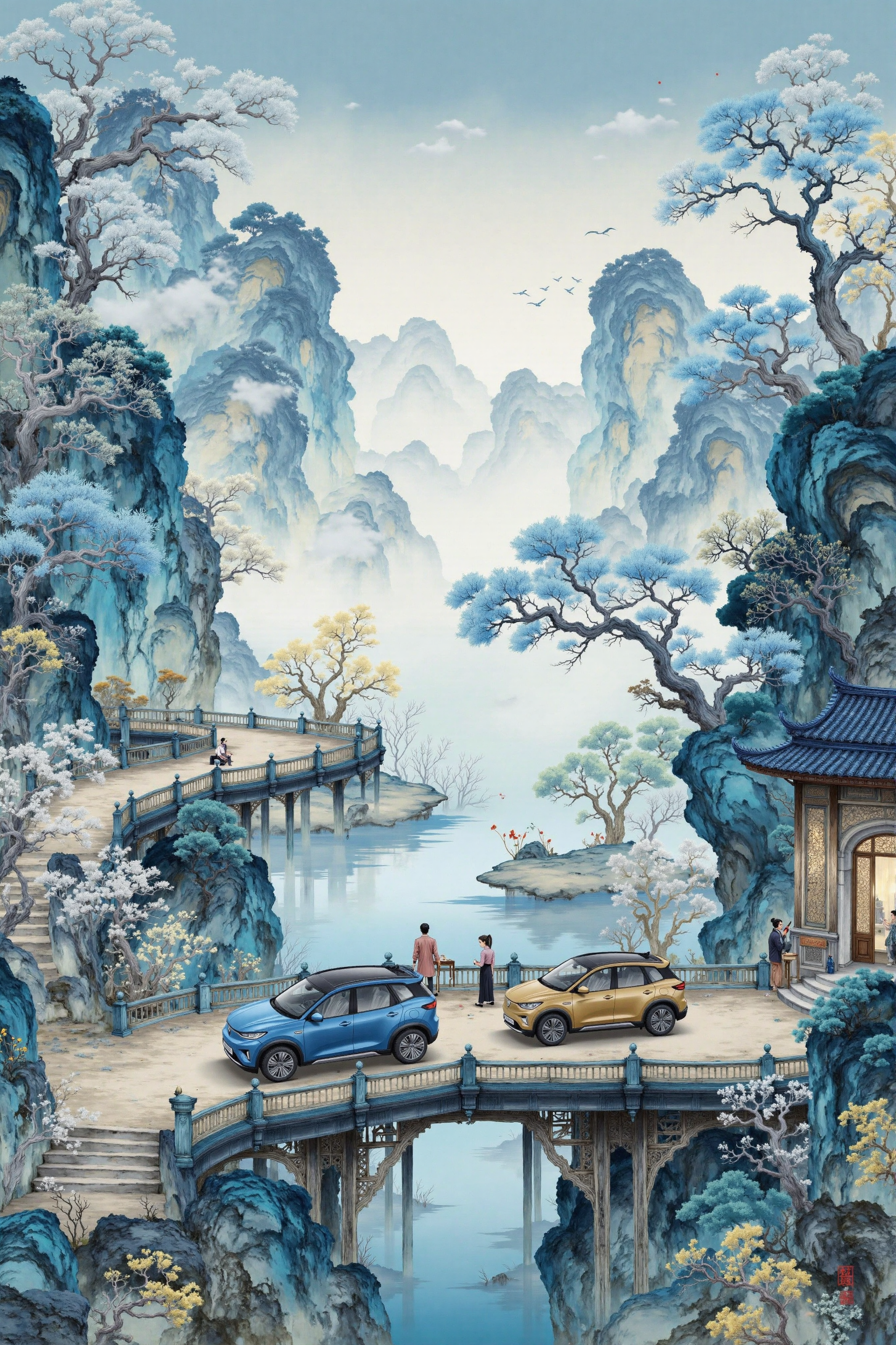 zgqtm_v3,Traditional landscape rendered with traditional splashed-ink landscape brushwork of mountain peaks and cloud mists,modern electric vehicles meticulously detailed driving on winding mountain roads,the silhouette of figures inside gazing out at the mountains and waters,in Zhang Daqian's artistic style,the fusion of ink wash and meticulous brush techniques,the collision of blue-green coloring and modern metallic textures,the inscription of "Oriental Intelligence" in calligraphy in the blank spaces,the texture of rice paper,vermilion seals,rendered in 8K ultra-high definition,
