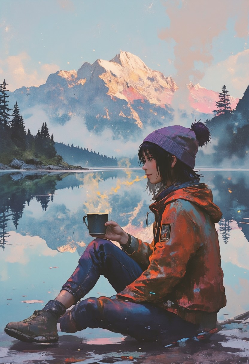 A woman sitting on a pier by a mountain lake, wearing a worn red hoodie with a white scarf and a light purple beanie on her head, wild brown hair pokes out from underneath. She is holding a steaming mug in her hands, smiling softly as she looks at the lake. Her breath creates a little steam. The background shows a serene lake reflecting the sky, trees and epic clouds, creating a peaceful atmosphere.