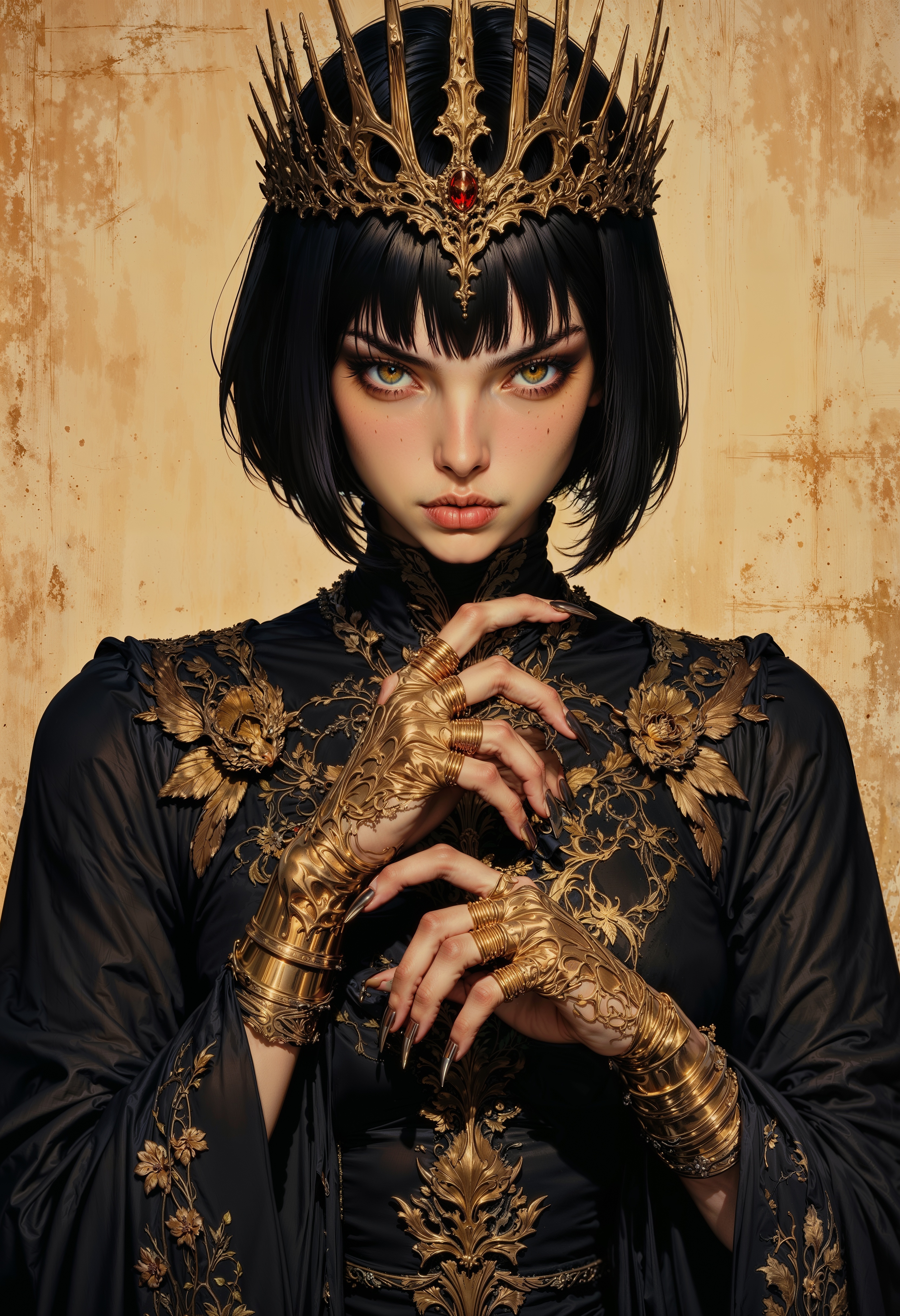 a digital drawing in a detailed, realistic art style. It features a young woman with fair skin and striking features, including sharp, almond-shaped eyes with long lashes and a straight, black bob haircut with blunt bangs. She has a stern expression, with her lips slightly parted. Her attire is regal and dark, consisting of a flowing, black garment with intricate golden embroidery and a high collar. She wears an elaborate, ornate crown adorned with sharp, metallic spikes, adding a fierce and powerful aura to her appearance. Her hands are prominently featured in the image, with long, pointed golden nails that have a skeletal, claw-like design, emphasizing her menacing and mystical presence. Each finger is adorned with multiple rings, also featuring intricate golden designs, which contribute to the overall opulent and otherworldly look. The background is a warm, earthy tone, with a texture resembling aged parchment, adding to the mystical and ancient atmosphere of the image. The overall color palette is dominated by shades of gold and black, enhancing the luxurious and dark fantasy theme.