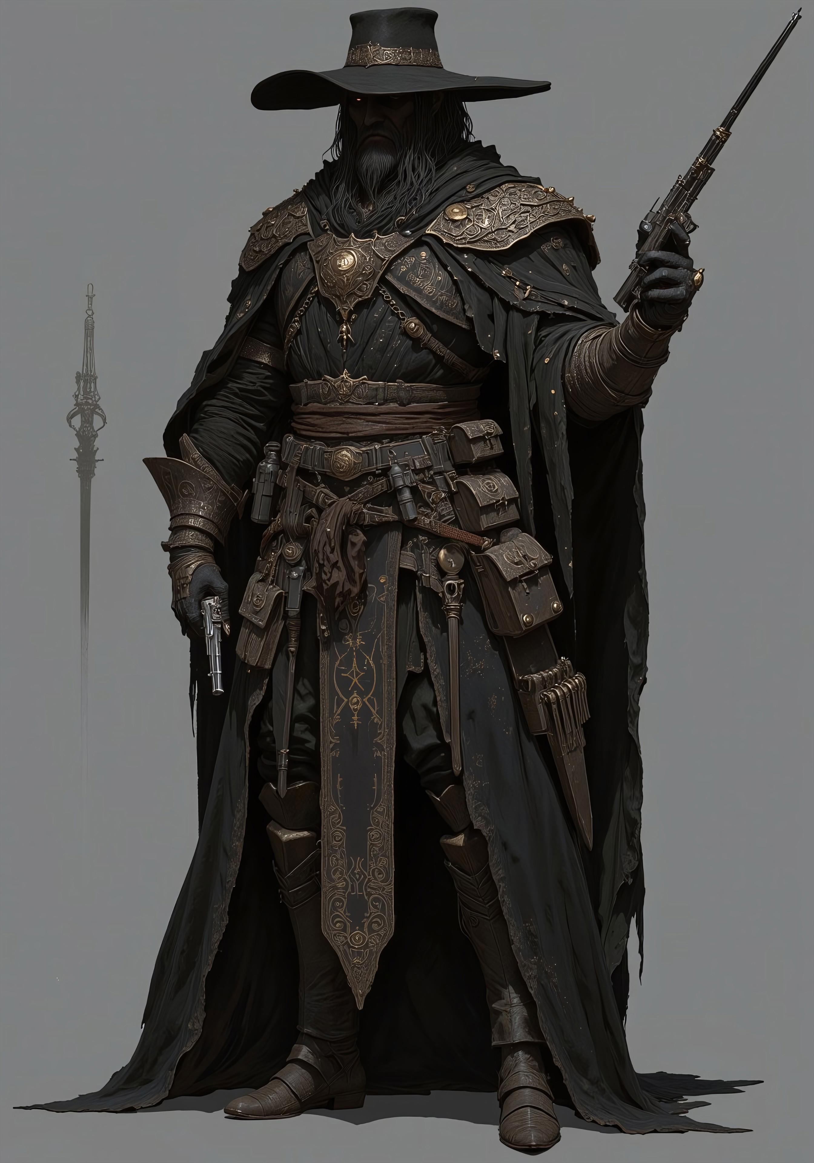 Dark, brooding figure, mature man, likely 30s-40s, with a dark complexion. Intense, serious expression; sturdy build, depicted in a dramatic pose. Worn, detailed dark-grey/black coat, heavy leather accents. Wide-brimmed dark hat, aged and weathered look. Numerous pouches, holsters, and accessories—including ammunition belts—adorn the coat. Dark-colored leather gloves. Complex, detailed tattoo with mystical symbols on arm, crafted with a dark golden/bronze-like style. The character holds a revolver in one hand and a long bow in the other. The image projects a gritty, medieval fantasy style. High-contrast lighting highlights the character's form and weaponry. Detailed textures showcase aged materials. Gray background, plain, with muted tones, creating an atmosphere of mystery and foreboding. Full body shot, slightly angled, from a three-quarter perspective. Realistic, detailed style; art deco influences. Precise rendering of form and detail.
