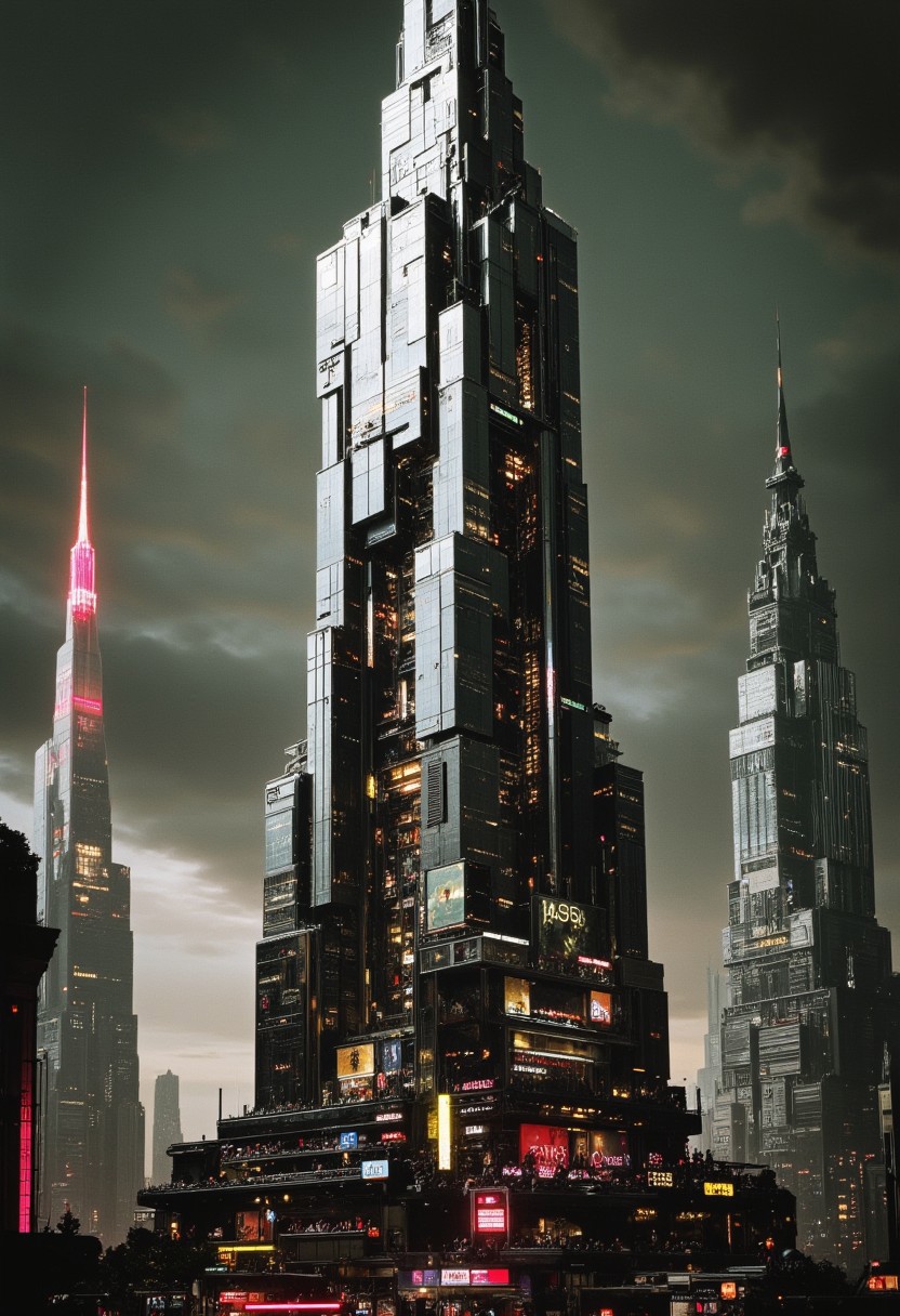 highest details, ultra hyper realism. highly detailed and realistic. intricate and highly professional artwork, an absolute masterpiece. photo of a complex gigantic science fiction skyscraper reaching into the sky , in the (style of patchwork surreal collage:1.6), polygon mesh, jagged, blocky, wireframe edges, centered composition, limited dark palette, unusual colors, atmospheric haze, highly dramatic ambient lighting color haze, atmospheric fog, digital corruption, washed-out background, desaturated world, bleached dystopia, monochromatic with vibrant color pops, flickering neon fractures, and glitching light pulses.