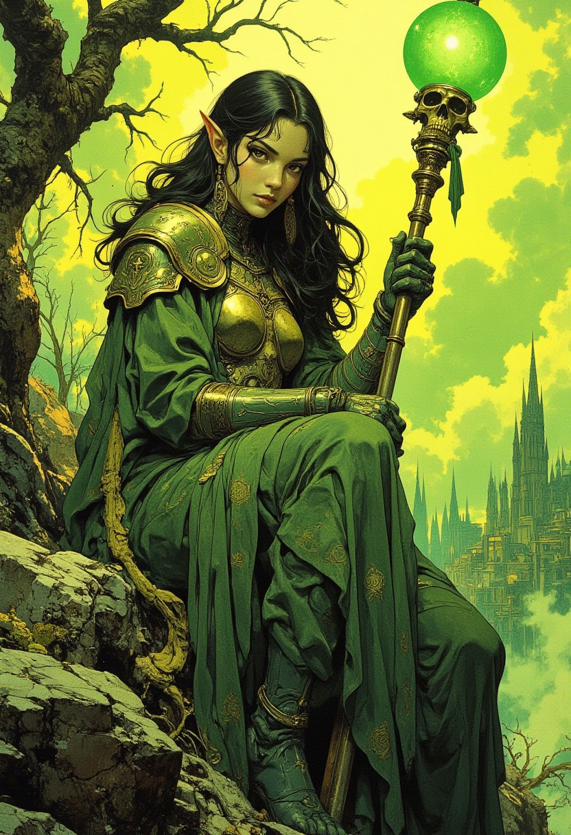 (style of jean delville). This is a highly detailed digital illustration in a fantasy art style. The central figure is a female elf with pointed ears, fair skin, and long, wavy black hair. She is dressed in intricate, ornate green armor with gold accents, including a breastplate, arm guards, and thigh guards. Her attire features elaborate patterns and designs, including floral and geometric motifs. She is seated on a rocky ledge, her legs slightly bent, and her right arm resting on her knee. In her left hand, she holds a tall, ornate staff adorned with a golden skull and a large, glowing green orb at the top, emitting a bright light that illuminates the scene. The background is a fantastical, surreal landscape with a mix of green and yellow tones. In the distance, there are tall, spires and towers of a city, possibly a medieval castle, shrouded in mist and fog. To the left, a large, twisted tree with gnarled branches adds a touch of darkness to the scene. The sky is a vibrant yellow-green, with wispy clouds and a sun-like glow. The overall composition is dynamic, with the figure's pose and the staff's light drawing the viewer's attention. The textures are rich and detailed, from the smoothness. Intricate, High Detail, Sharp focus