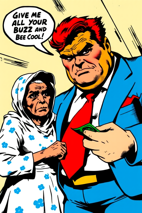 a fat old Classic Comicbook Supervillain with orange hair and wearing a blue suit with red tie is stealing money from a frail poor sad old beggar woman in a white dress made from blue flowered fabric, the supervillain has a thought bubble that reads "Give me all your BUZZ and Bee Cool!"