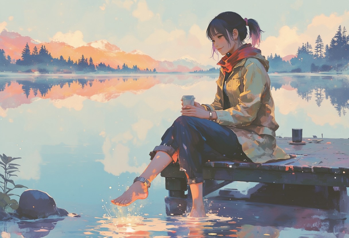 The image features two distinct scenes: 1. **Top Image**: A young woman sitting on a pier by a lake, wearing a beige coat with a red scarf and a red bow in her hair. She is holding a cup in her hands, smiling softly as she looks at someone nearby. The background shows a serene lake reflecting the sky and trees, creating a peaceful atmosphere. 2. **Bottom Image**: A close-up of a person's feet standing in shallow water. The water reflects sunlight, creating a warm, shimmering effect. The surrounding environment appears calm and natural, adding to the tranquil vibe of the scene. Both images evoke a sense of comfort and connection with nature.