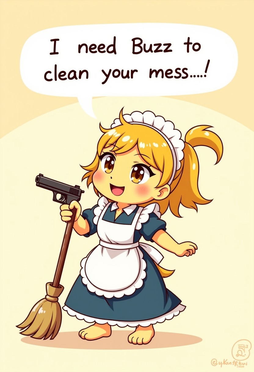cartoon ,cute emo maid with broom in one hand and pistol in other, talking, "need Buzz to clean your mess," in the speech bubble,