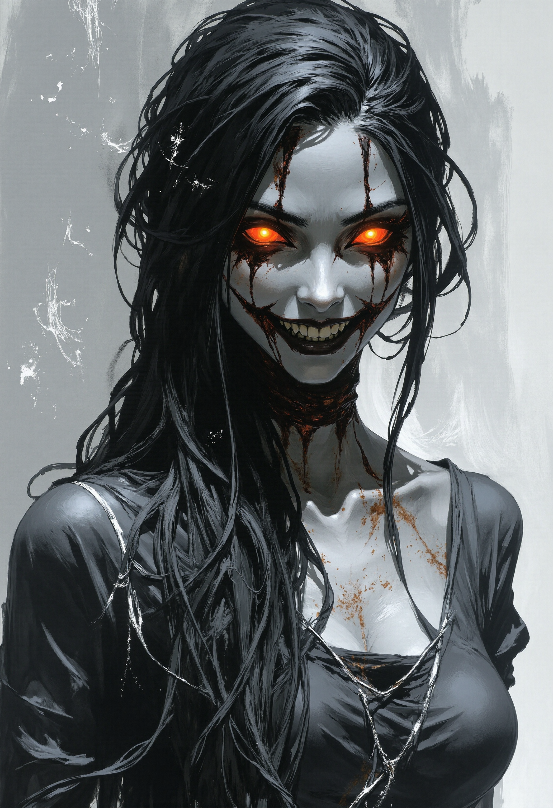 fg, A digital illustration of a woman with long, messy black hair framing her face, piercing glowing red eyes, heavy dark smudged makeup creating a sunken eye effect, a wide unsettling toothy grin. She wears dark, slightly ragged clothing, with subtle dark red smudges around her neck. Digital painting in the style of a dark fantasy horror illustration, eerie atmosphere, dramatic cinematic lighting, muted grey smoky background.