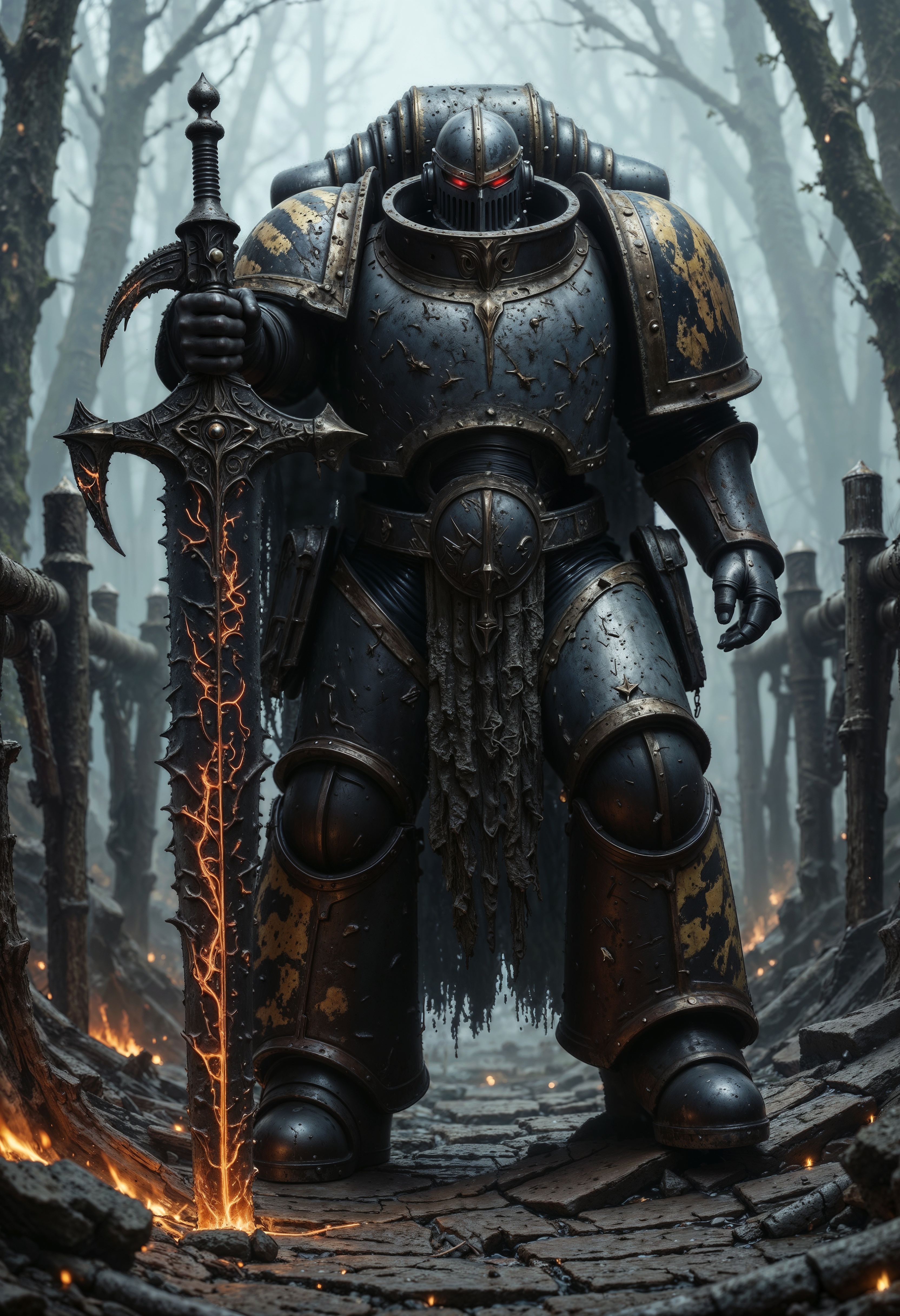 A Powerful IronW40k space marine, draped in tattered, dark power armor that pulses with a faint, eerie glow, stands on a creaking wooden bridge. He points the tip of a massive, rune-etched sword menacingly at the camera, the blade crackling with dark energy. Shadows swirl around him, and the misty air is thick with tension. red flames flicker within his hollow eyes, reflecting the bridge's warped, splintered planks, over the sword camera view