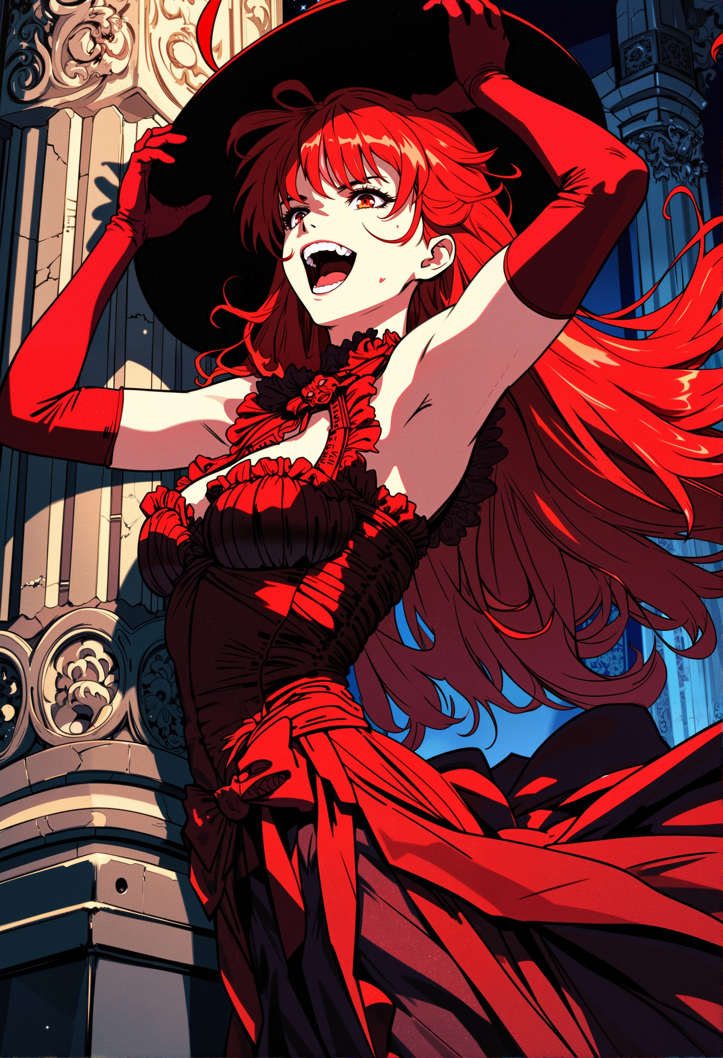 hyper-detailed, modernretroanime, aidmaDarkGothicAnime, Anime, flat color, thick lips, long eyelashes An intense anime-style character study focusing on a witch-like girl adorned in a sweeping crimson dress that flows like liquid fire in the darkness, every fold shaped with chaotic elegance. Her long, vermillion hair erupts backward in thick, unruly waves, capturing the moment of movement with graphic precision, while a giant round hat encircles her face like a halo of ruffles, sculpted from intricate gothic lacework and soft velvet frill. Her face is lit from below, casting an eerie, almost supernatural glow across her chin and cheeks, as her sharp teeth flash through a wide, open-mouthed laugh. (She is leaning dramatically backward while gripping the edge of her oversized hat with both hands, elbows raised high, shoulders scrunched in a wild grin, head thrown fully to the side, and torso angled diagonally as if she’s just twirled violently.) Her gothic gown consists of multiple layered fabrics—some sheer, some opaque—cascading from her waist in asymmetrical panels, tied with exaggerated bows and trailing threads. Long red gloves stretch skin-tight along her arms, reflecting a subtle silk shine, and the hem of her dress wraps upward as if caught in a storm. A massive stone column looms beside her, carved with crumbling floral motifs, casting broken shadows. The lighting is intensely directional, creating high-contrast highlights on her shoulder and gloves while cloaking the background in pure darkness. This anime composition is imbued with visual tension—hair rendered with motion arcs, textures dancing between velvet and sheer organza, and dramatic shadows that deepen every fold into dark mystery. <lora:FluxDFaeTasticDetails:0.3> <lora:Echi_Anime_Style_FLUX:0.35000000000000003> <lora:RetroAnimeFluxV1:0.65>