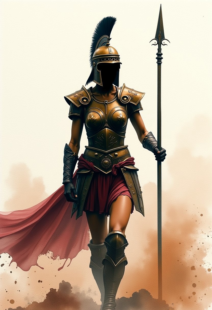 Impressionistic Watercolor Ink Wash, rough canvas, Silhouette Art, magnificent, warrior woman in bronze age Greek armour, thrusting a spear towards the viewer, dynamic image, abstract battlefield background
