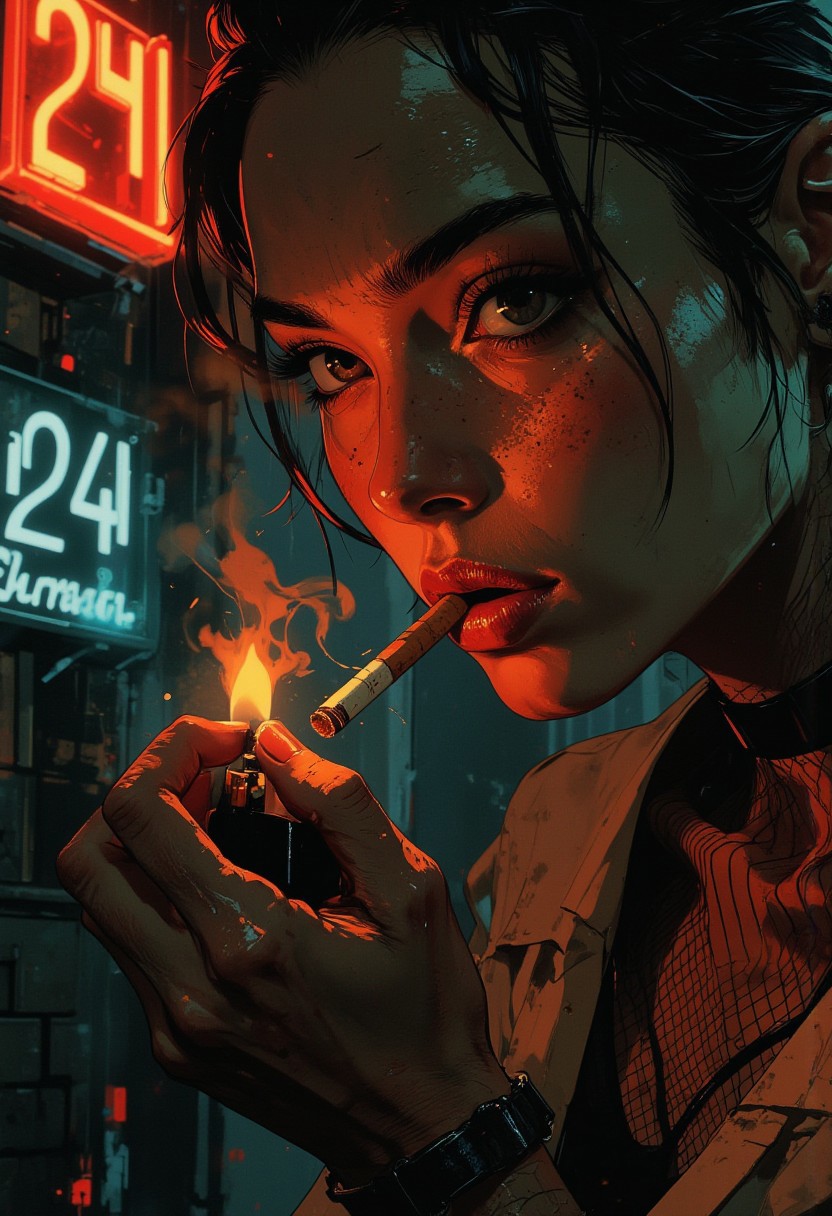 (masterpiece cinematic close-up:1.7), (8k uhd:1.3), (moody Rembrandt lighting:1.6), [woman: (delicate fingers gripping cigarette:1.8), (soft lip contact with filter:1.9), (snow-white hair illuminated by Zippo glow:1.5), (crimson eyes focused on flame:1.7), (black fishnet stockings with rain droplets:1.4), (choker chain reflecting fire:1.3)], [action: (moment of ignition:1.9), (small controlled flame:1.6), (tobacco ember beginning to glow:1.8), (first smoke tendril rising:1.7), (wind protecting face from flare-up:1.5)], [composition: (extreme foreground cigarette:1.9), (Dutch angle:1.2), (shallow depth of field:1.6), (face 70% visible behind hand:1.7)], [environment: (rain suspended mid-air:1.4), (neon "24h" sign bokeh:1.5), (wet brick wall texture:1.3), (steam rising from manhole:1.2)], (textures: (Zippo engraving details:1.4), (lipstick imprint on filter:1.6), (mascara smudge from rain:1.3), (fishnet weave patterns:1.5)