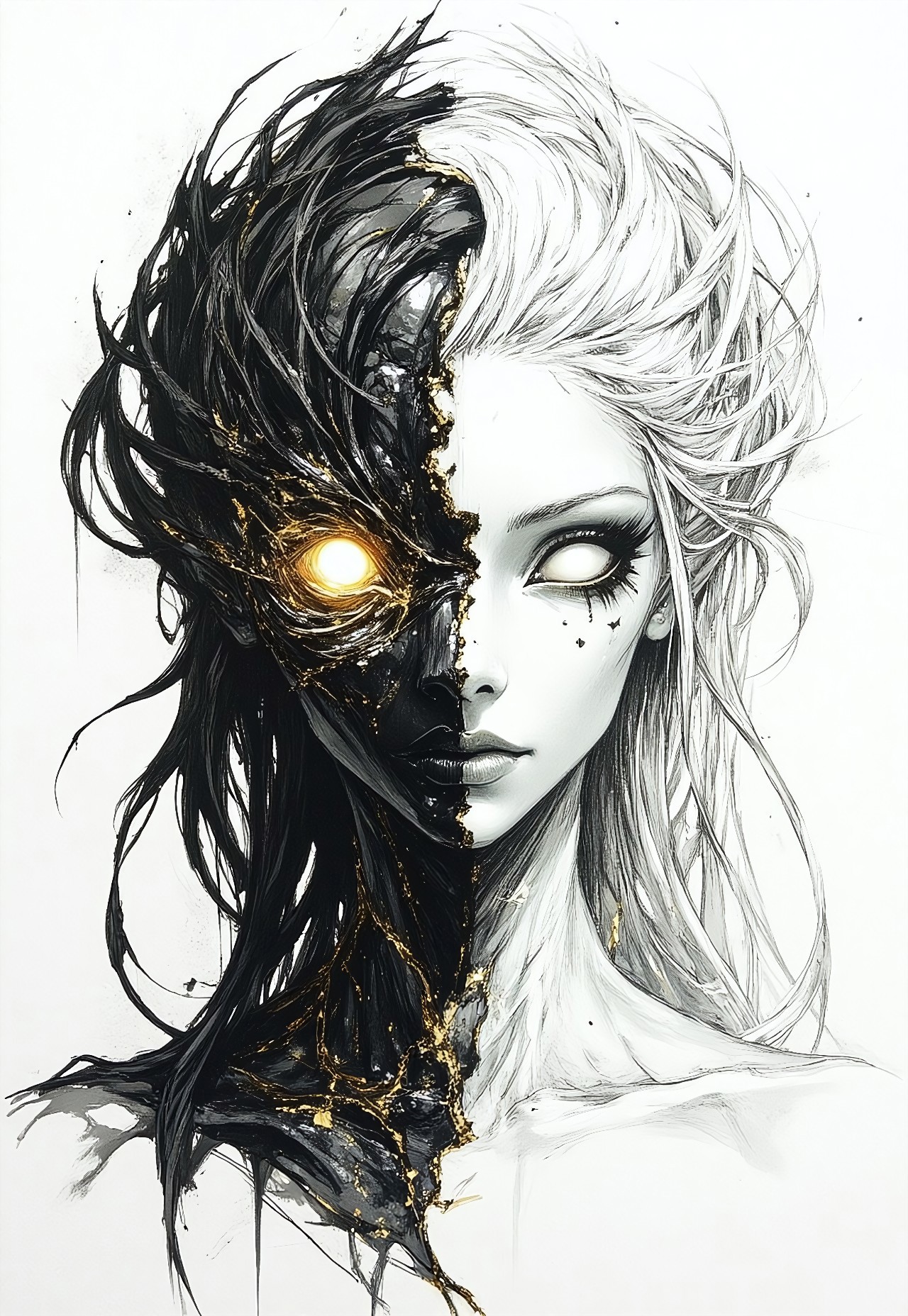 fg, A portrait of Hel, the ruler of Helheim. Her marvelous wild mane covers part of her beautiful face and bare chest. Both eyeballs are completely blank and featureless, devoid of pupils and irises, and extend across the entire eye region, blending seamlessly into the surrounding facial area, while the eyes remain fully open. The face is divided into two halves. The left side shows signs of decay and decomposition, with lifeless dark-coal skin, hard bones are visible under the torn skin, shreds of golden ash detached from her skin. Her left eyeball is completely golden. The right half of the face is of unearthly beauty, with immaculate, flawless white skin. Her right eyeball is completely snow-white. The transition between the two halves of the face is fluid and unobtrusive, symbolizing the brief moment between life and death. The picture showcases a surreal and abstract style, created using pencil and ink, characterized by a monochromatic scheme with predominant shades of black, white, and gray, which has been digitally enhanced.