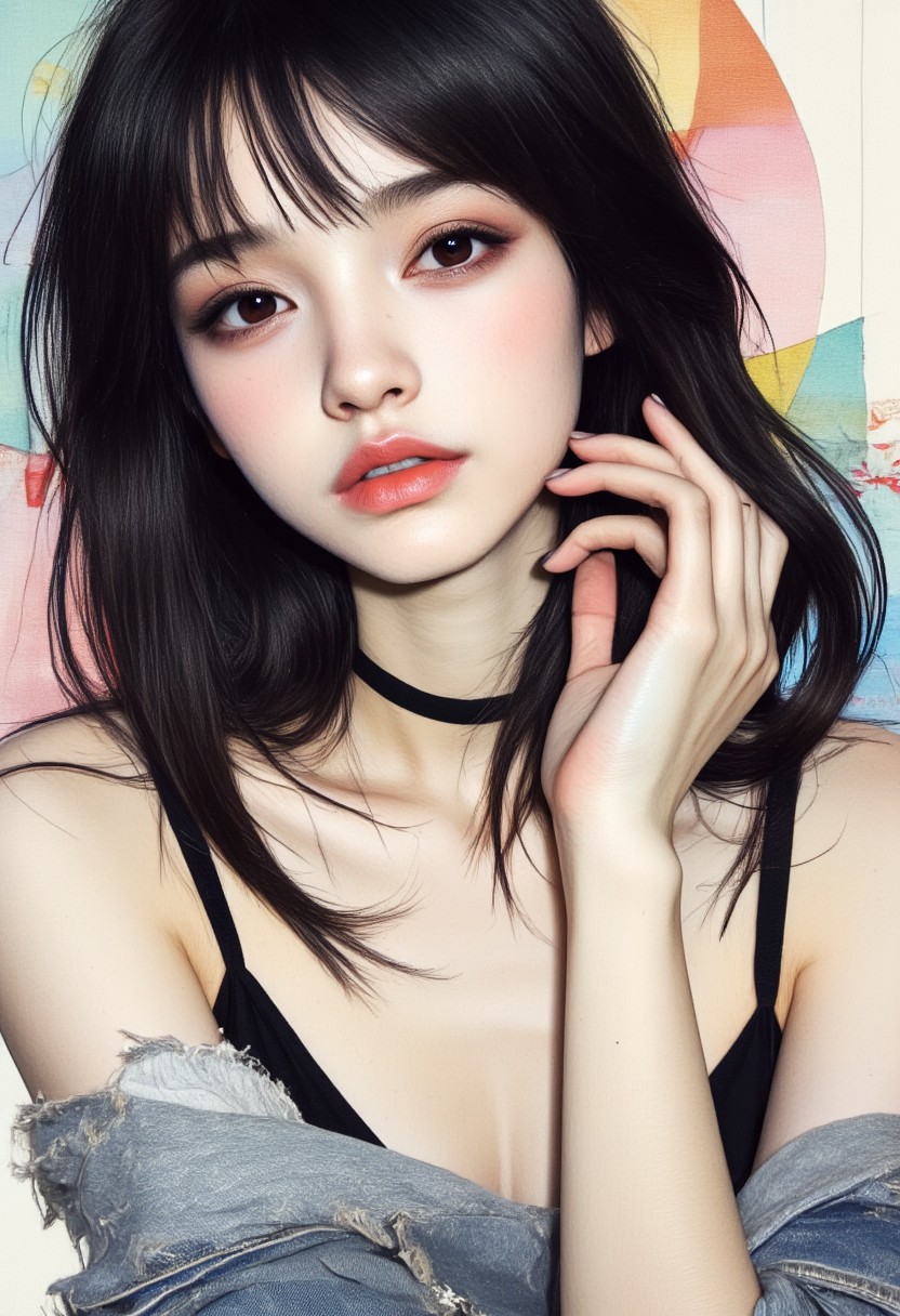 OBxiaoxiang, Inkplash art vibrant colours , inksketch, Silhouette Art, magnificent, inksplash portrait of stunning japanese woman, long dark hair with platinum streaks, sidelocks, bangs, seductive, sultry, lustful, red lips, direct gaze, light hitting one side of face, inksplash abstract background
