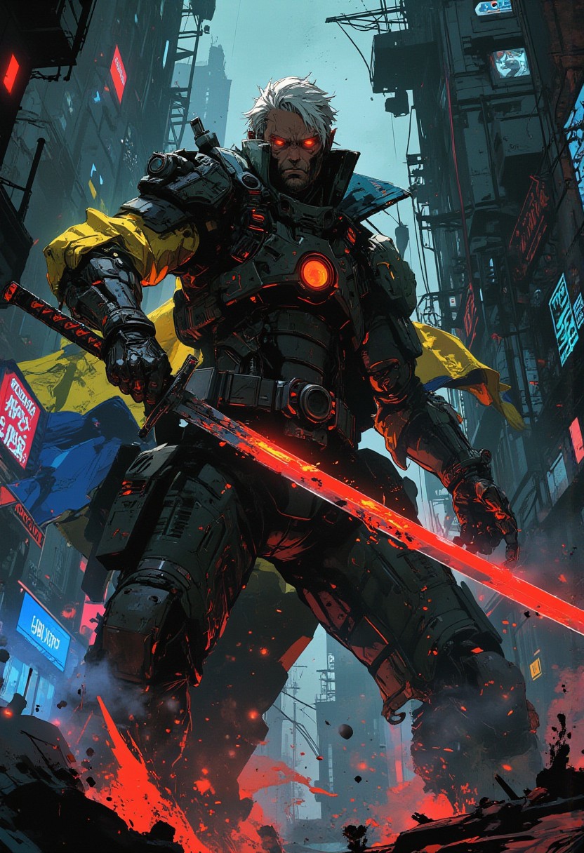 (metal gear rising revengeance:1.6), <lora:samuel_rodrigues:0.8>, [Samuel Rodrigues: (cybernetic exoskeleton:1.7), (crimson plasma-edged katana:1.9), (battle-torn Brazilian flag cape:1.5), (glowing ocular implant:1.6), (muscular definition under armor plating:1.8), (sadistic smirk:1.7), (white hair with blood streak:1.4), (dynamic mid-swing pose:1.9)], [Environment: (collapsing skyscraper:1.5), (raining debris:1.3), (sliced mechs sparking electricity:1.6), (neon-lit warzone:1.4)], [Style: (cell-shaded realism:1.7), (motion blur on blade:1.8), (volumetric rain effects:1.5), (blood splatter frozen in time:1.6)], (emphasis: (katana grip:1.9), (cybernetic knee joint details:1.7), (unreal engine 5 cinematic:1.8), (hdr lighting:1.6). <lora:mgr_cyberware_v1:0.6> + <lora:katana_dynamics:0.7>