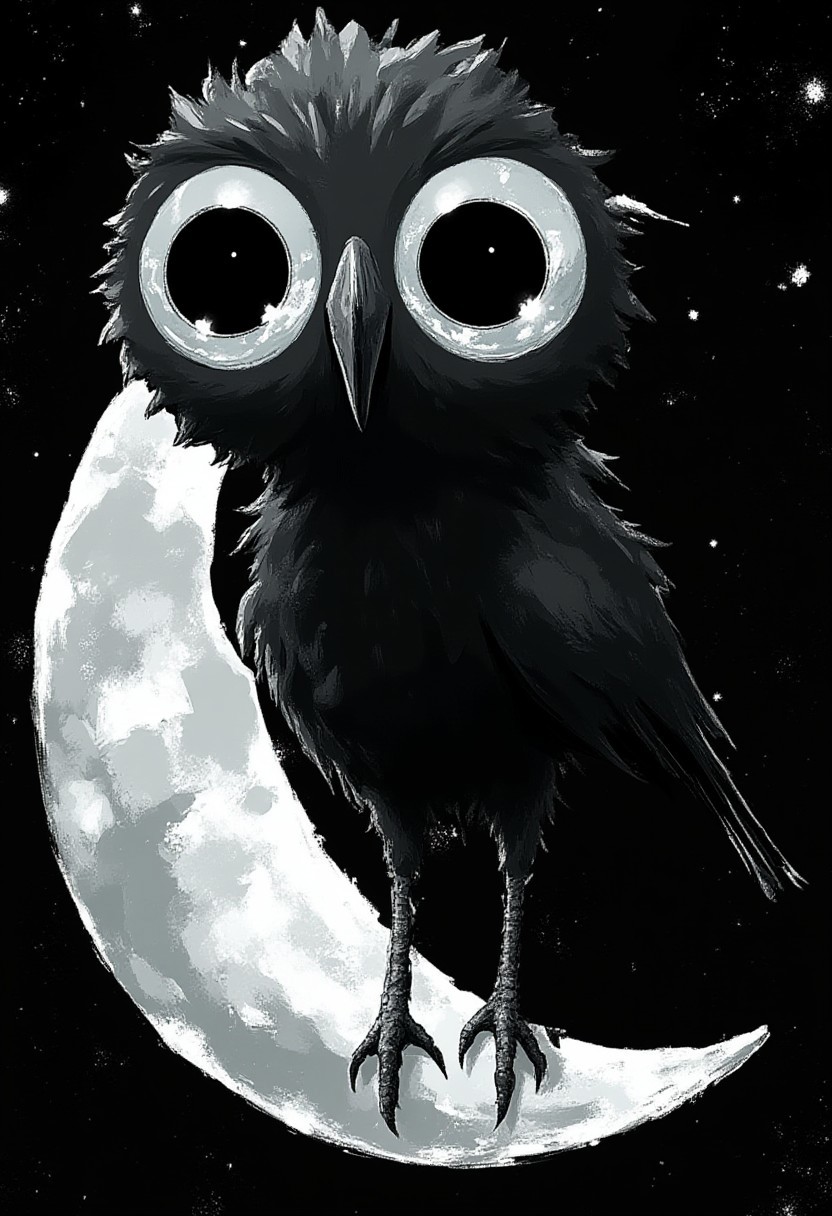 A whimsical illustration of a polygonal raven with an impossibly oversized geometric head in monochromatic black and white, perched on a crystalline crescent moon composed of sharp angular facets, digital painting where crisp geometric structures blend with expressive ink-like brushstrokes, featuring stark white light emanating from within the raven's prismatic form, starlit cosmic background reduced to precise white dots against deep black space, characteristic Tim Burton inspired design with enormous eyes rendered as gleaming silver orbs that pierce through the darkness, creating a dreamy contrast where mathematics meets gothic whimsy with no color to distract from the dramatic silhouettes
