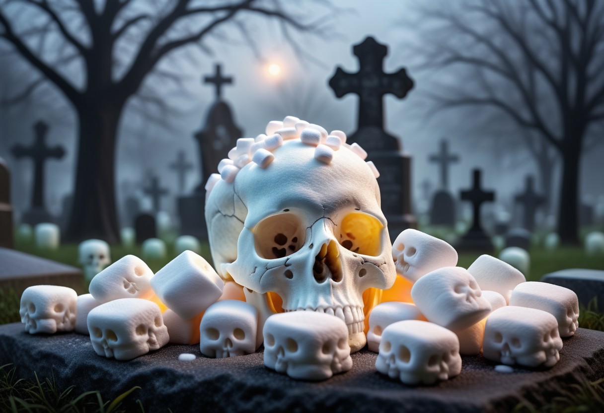 Skull made of gooey Marshmallows, close up, cemetery background, dark, foggy, spooky, vibrant, photography, high quality, detailed, realistic