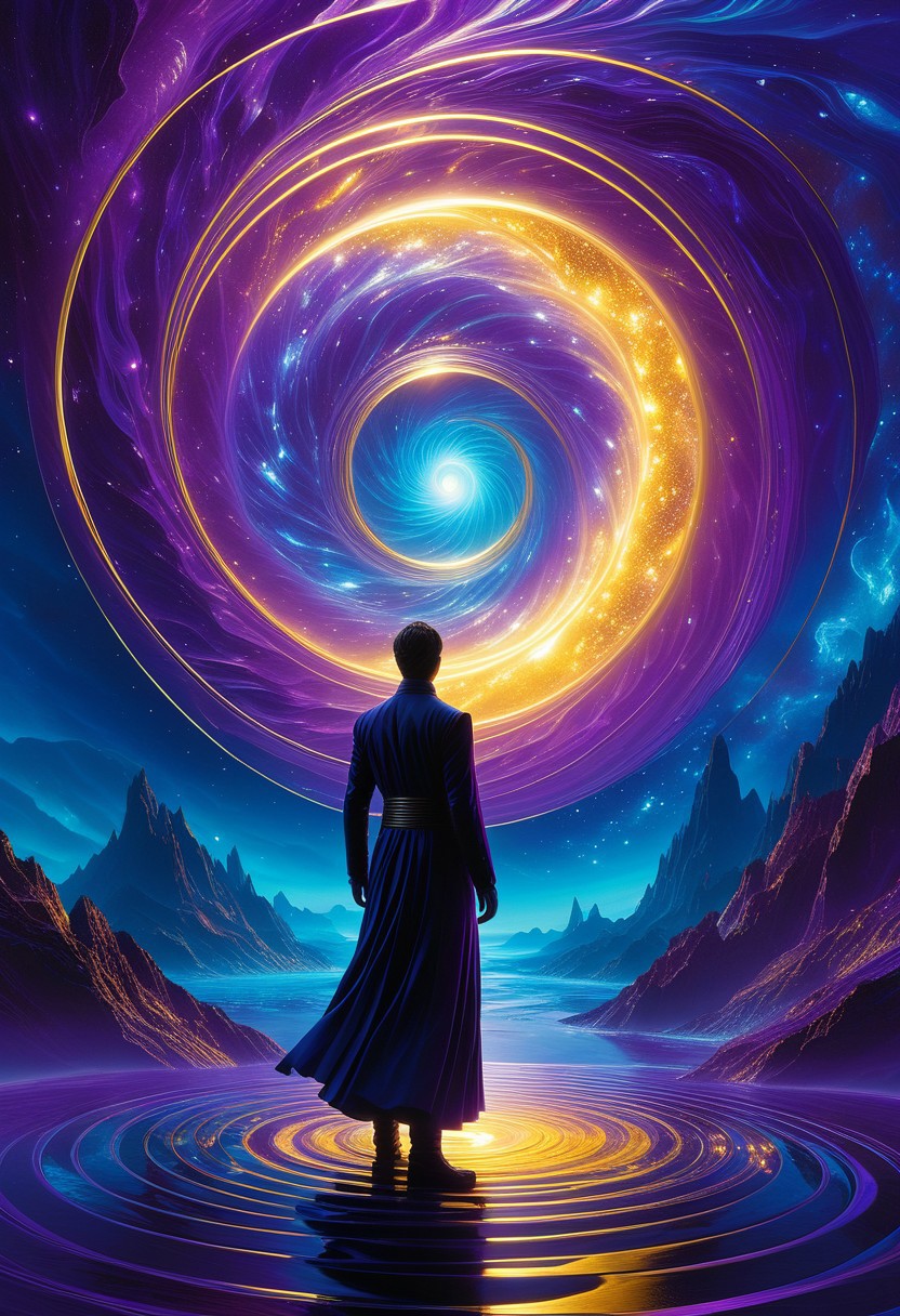 Neo-Surrealism, Sci-Fi, a lone figure radiating an ethereal glow, set against a vibrant, swirling backdrop of deep blues and purples, with golden hues, reminiscent of high-end fantasy concept art., refined, defined, highly detailed, follow negative prompts