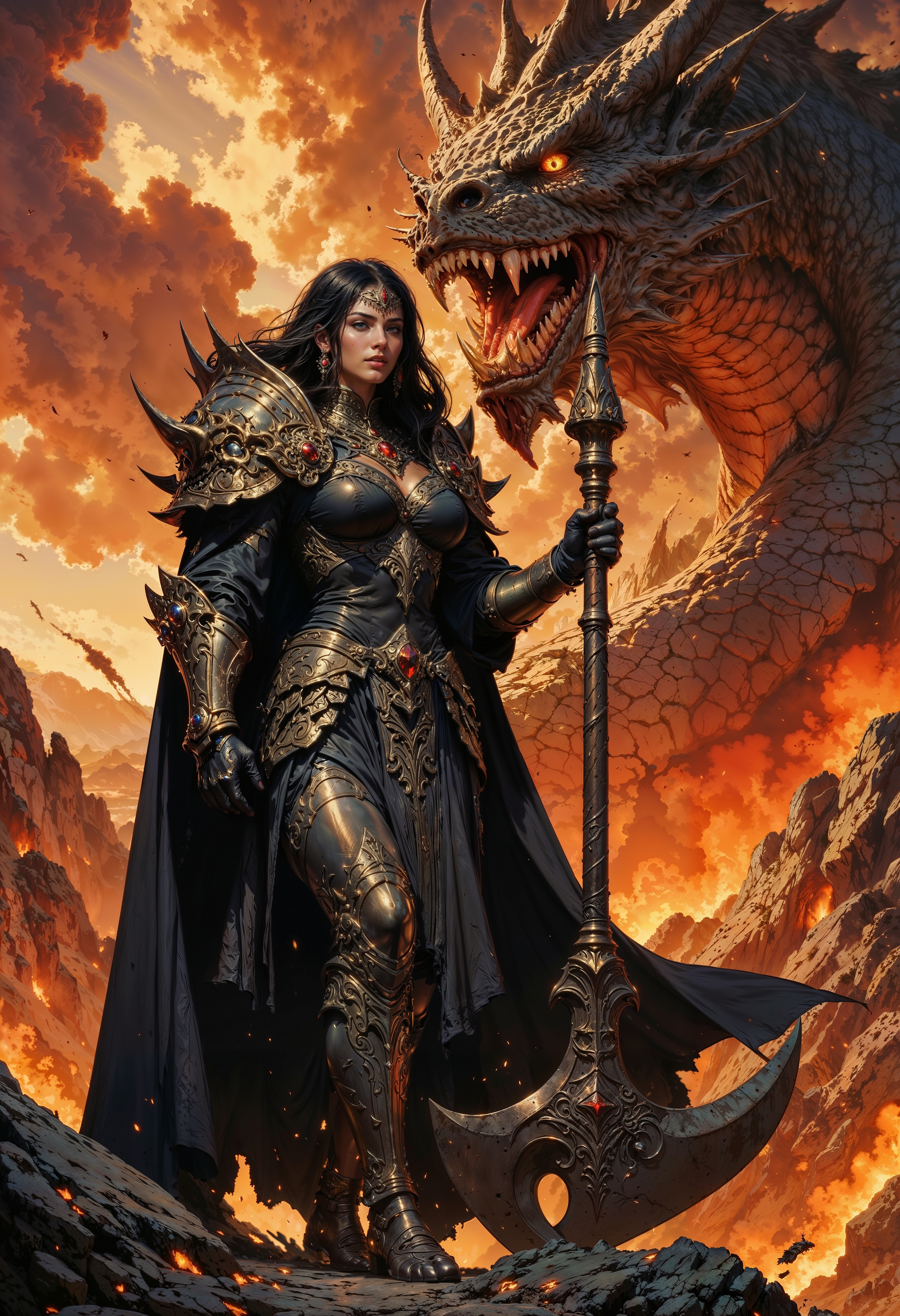a highly detailed, digital fantasy artwork depicting a fierce female warrior standing heroically against a backdrop of a menacing dragon. The scene is set against a dramatic, fiery sky with large, billowing clouds tinged in shades of orange and yellow, suggesting either dawn or dusk. The woman, who appears to be of a Caucasian ethnicity with fair skin, has long, flowing black hair that cascades down her back. She is dressed in dark, metallic armor that gleams under the fiery light, covering her from neck to ankles, with intricate designs and patterns. Her armor includes a high-collared, dark cape that billows behind her, adding to the sense of motion and strength. In her right hand, she wields a massive, ornate battle axe with a wide, spiked blade that is as tall as she is. The axe head is adorned with detailed engravings, and the handle is wrapped in leather. The dragon, looming behind her, is colossal, with scales that glisten in the firelight, revealing a menacing, open maw filled with sharp teeth. The dragon’s eyes burn with an intense, fiery glow, adding to the overall sense of danger and intensity. The artwork is rich in texture and detail, capturing the dynamic tension between the warrior and the dragon.