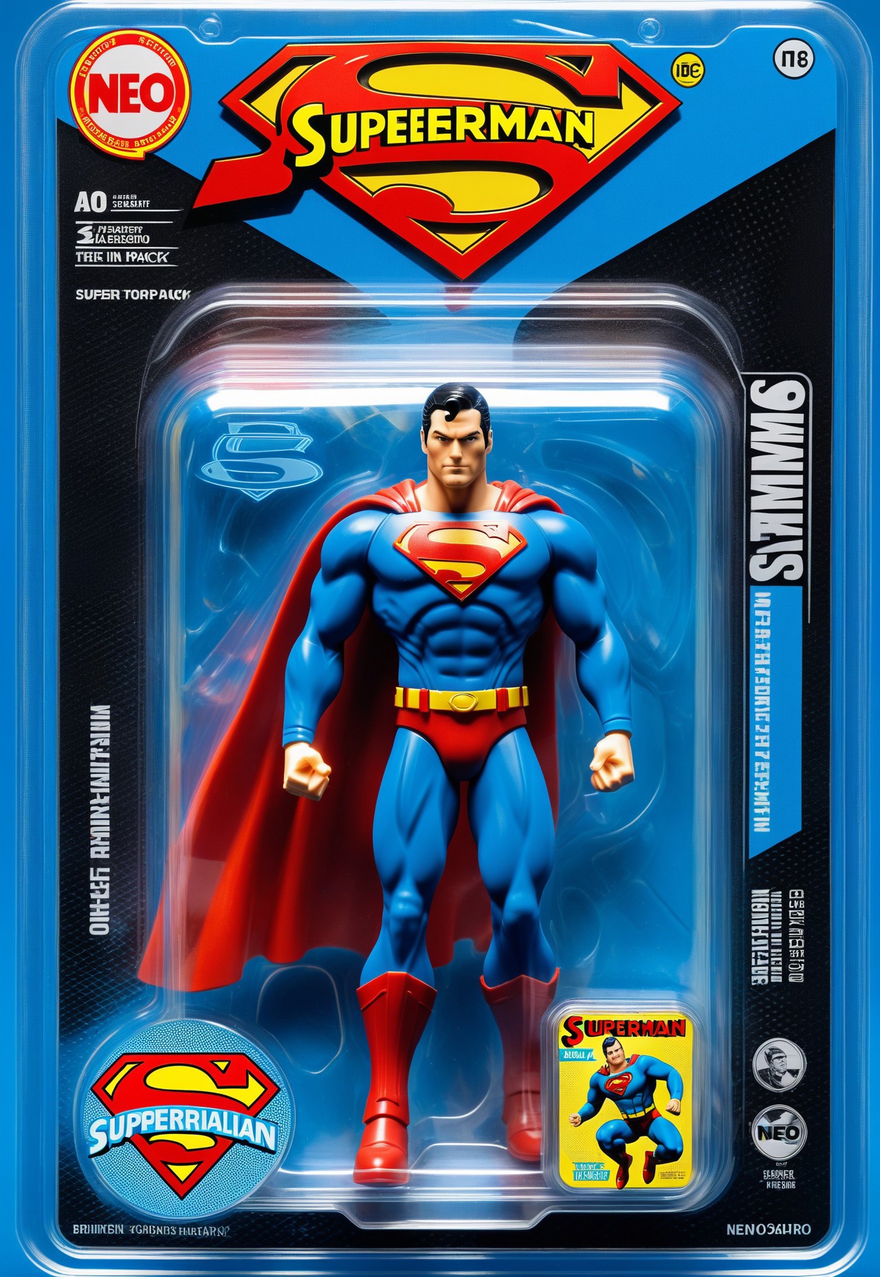 Neo-Surrealism, a detailed Superman action figure posed in a transparent plastic blister pack, captured with precision photography and a hint of pop art flair,, refined, defined, highly detailed, follow negative prompts