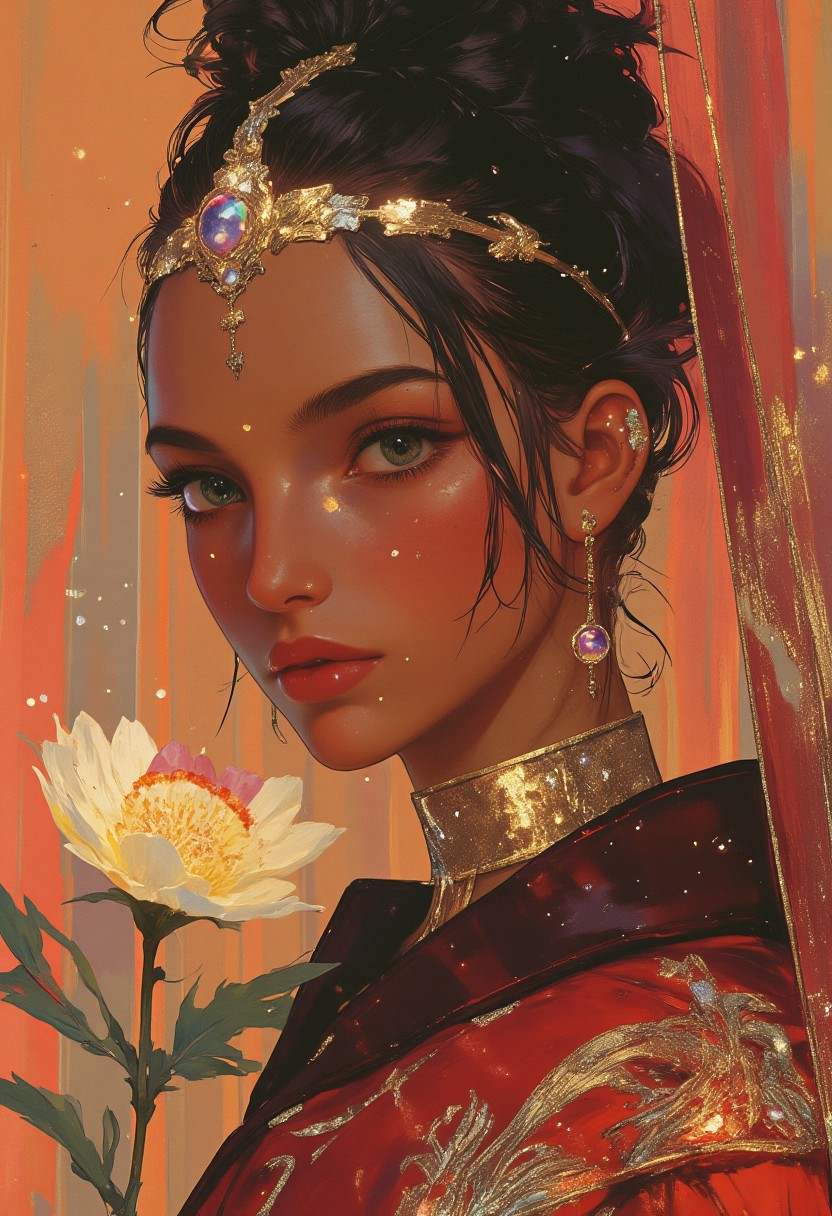 A hyper-detailed mid-shot of a regal woman dressed in opulent medieval robes of deep crimson, intricately embroidered with silver vines and floral motifs. A translucent silk scarf with faint glittering edges rests lightly around her shoulders, catching the light as it flows. Her intense green eyes hold an enigmatic expression, enhanced by her luminous, fair complexion and naturally glossy skin that reflects the ambient glow. Dangling ruby earrings complement her intricate gold tiara, which sparkles faintly. Partially obscuring her lower face is a vibrant protea flower, its exotic and bold petals layered with crystalline droplets. The background is an abstract interplay of soft glowing amber and faint golden light, with glitter particles suspended in the air, adding to the scene’s magical ambiance.