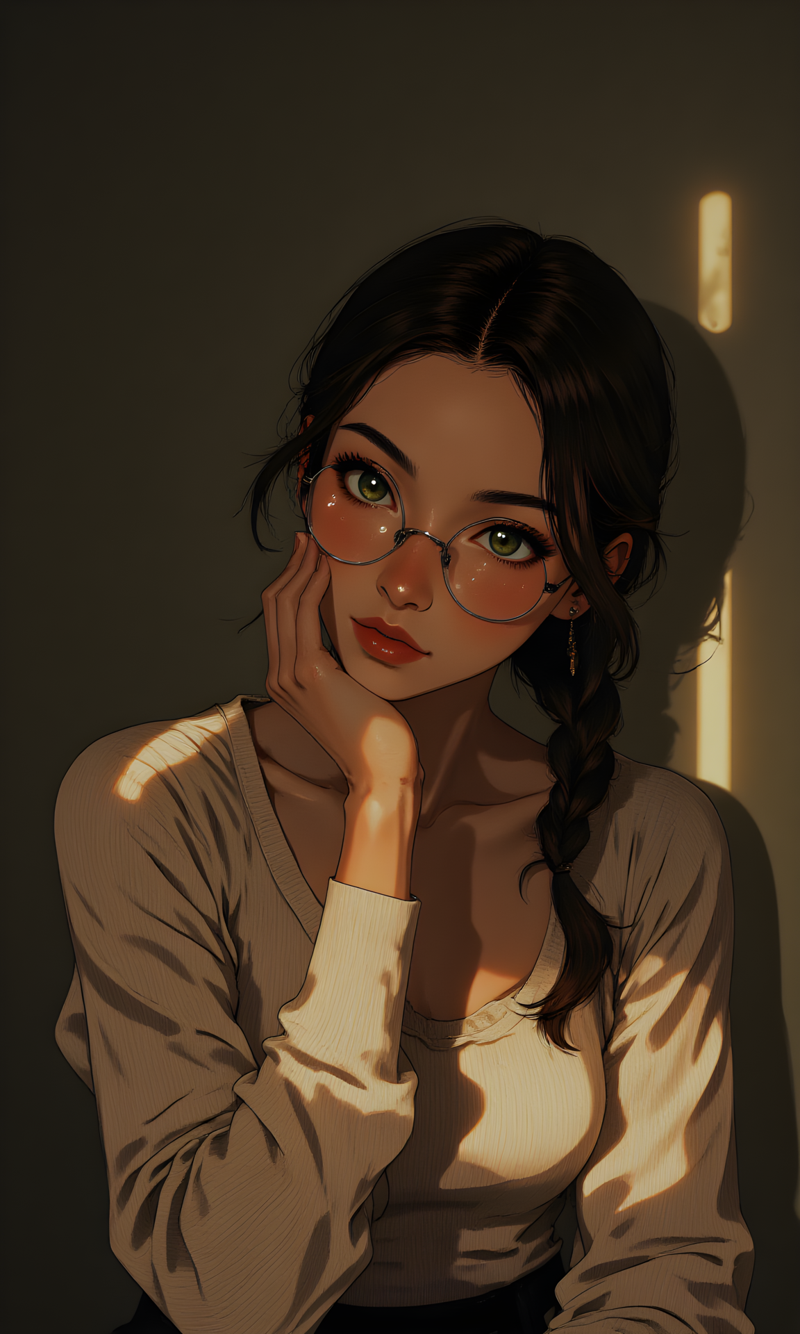 The setting is a softly lit, minimalist space that draws all attention to the subject. The background is a deep, neutral tone, creating a clean and uncluttered atmosphere that enhances the details of her appearance. Her long, dark hair is styled in a neat braid that cascades down her shoulder, adding a touch of elegance and structure to her look. She wears round glasses with thin frames, their reflective lenses catching the light subtly as they frame her striking green eyes. Her expression is calm yet thoughtful, her gaze directed slightly upward, suggesting a moment of quiet contemplation or perhaps observation. One hand rests gently against her cheek, while the other hangs naturally by her side, emphasizing her relaxed posture. Her attire is simple yet stylishâa soft, textured top that clings to her form, accentuating her silhouette with gentle folds and curves. The fabric appears smooth and comfortable, adding layers of texture and depth to the composition. The overall mood is one of quiet confidence and introspection. The interplay of light and shadow creates depth, highlighting the contours of her face and the texture of her clothing. It is a portrait that feels both timeless and intimate, capturing a fleeting instant of beauty and poise amidst a serene environment., <lora:FLUX\jul\J_Anime:0.7>, <lora:FLUX\RealAnime:0.7>