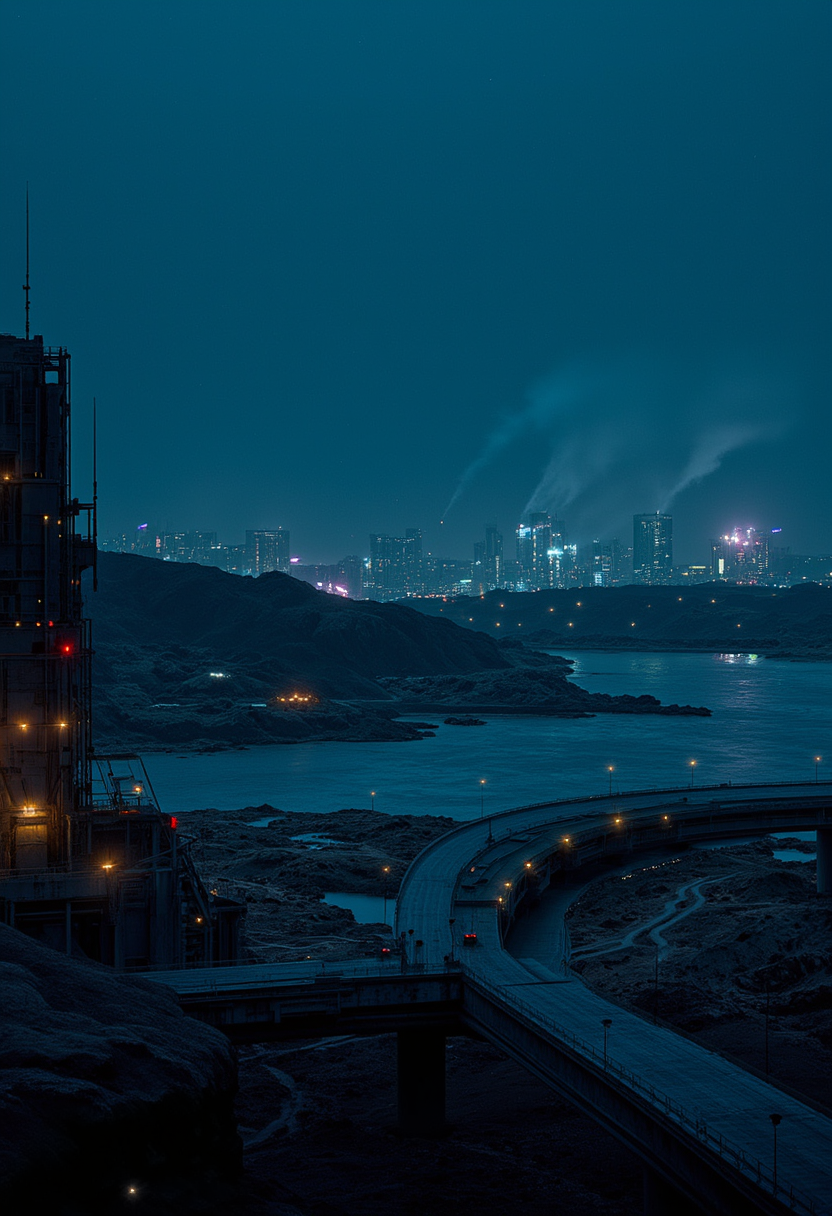 dark fantasy aesthetic. timelapse, long exposure, , digital artwork of a futuristic, natural colors, , epic. luminescence, ultra realistic, hyper detailed, soft lighting , epic scale. (detailed digital painting, detailed oil painting). gradient deep blue sky, depth of field, starry sky, city lights, slag heaps in the distance, in the distance you can see the river, working factories, multi-storey buildings, rock dumps, rare smoke from pipes, slightly pink night sky after sunset, beautiful, masterpiece, highly detailed, professional photo, 8K. (Depth of field),,. Sharp shadows on the ground. phantasmagoria. An otherworldly atmosphere., . unimaginable quality, 8K, .. monumental, Otherworldly atmosphere. (Depth of field), detail. mythp0rt, Stylish, charismatic.,,. . .. An otherworldly atmosphere. (Depth of field), low saturation, detail. mythical, stylish, charismatic. , , masterpiece, ,Image quality, , CPA, UNI_SCI_FI_CORE.. .. , . igiex. .UNI_SCI_FI_CORE. j-art, j_art, illustration-fen,