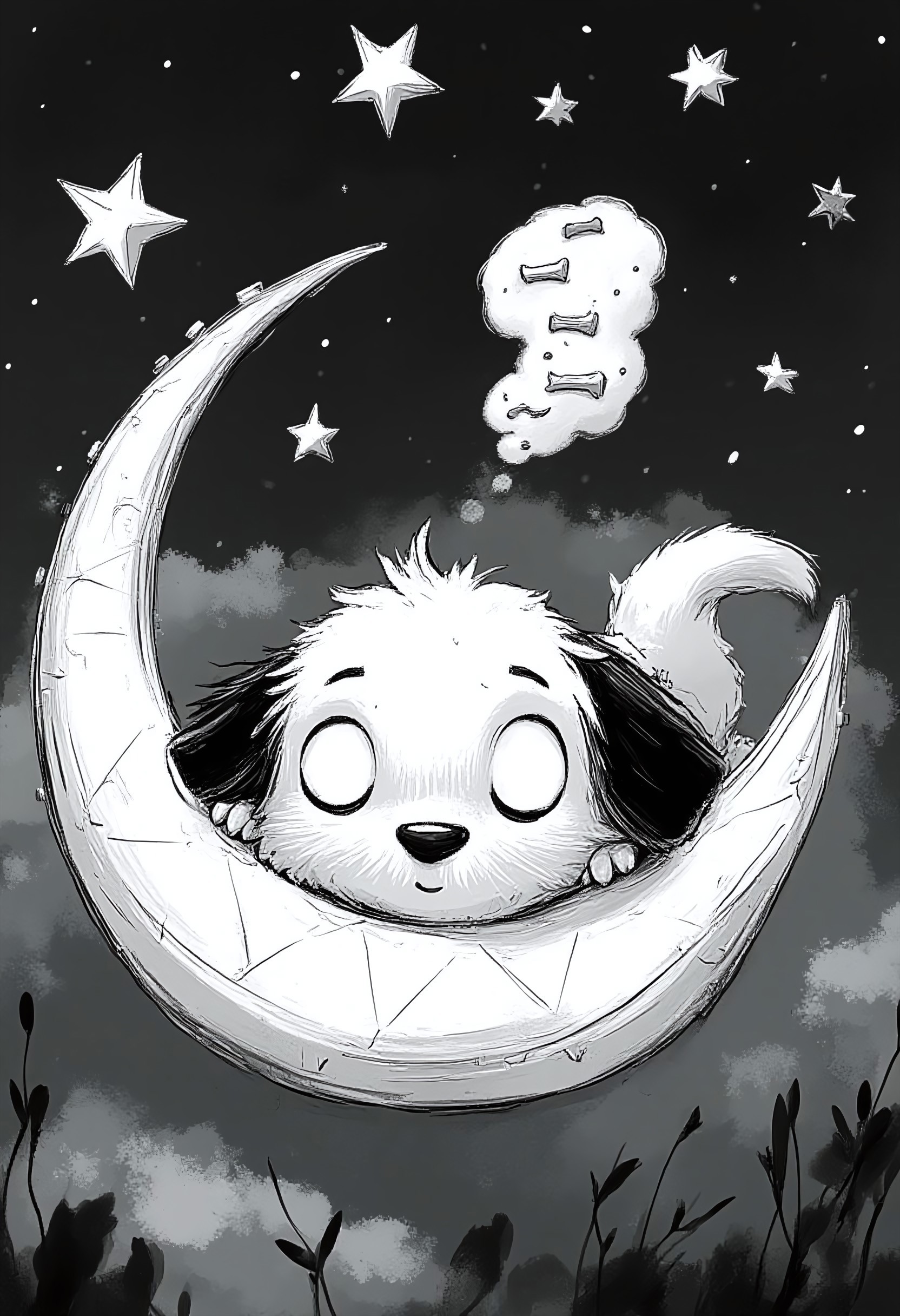 A whimsical illustration of a tiny dreaming puppy with a disproportionately huge head in pure black and white, curled up on a geometric crescent moon, surrounded by floating polygonal stars and mathematical dream bubbles containing bone-shaped constellations, digital painting with soft brushstrokes showing fluffy fur textures through precise patterns of light and shadow, night sky background with wisps of cloud rendered as flowing mathematical equations, characteristic Tim Burton inspired design with oversized closed eyes and a small smile suggesting sweet dreams, creating an endearing monochromatic scene that balances innocence with the surreal geometric styling