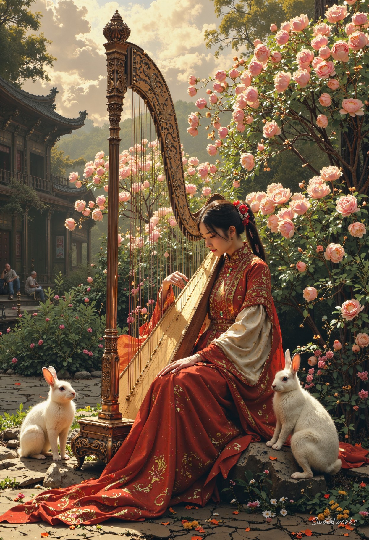 A gorgeously dressed young lady in red Hanfu is playing the harp in a garden. Two little white rabbits sit nearby, ears perked up, intently listening, creating a picture of ethereal beauty.