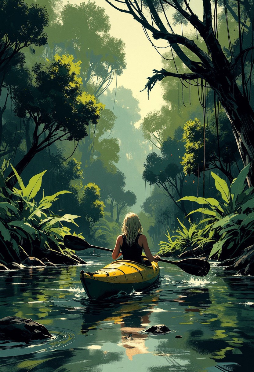 in the style of ck-mgs, nistyle, Special Ink-drawing mode, intricate linework with expressive contrasts, Mh1$AgThS2, blonde woman paddling a kayak up a tropical rainforest river, rainforest trees, vines, reflections, diffuse dim light