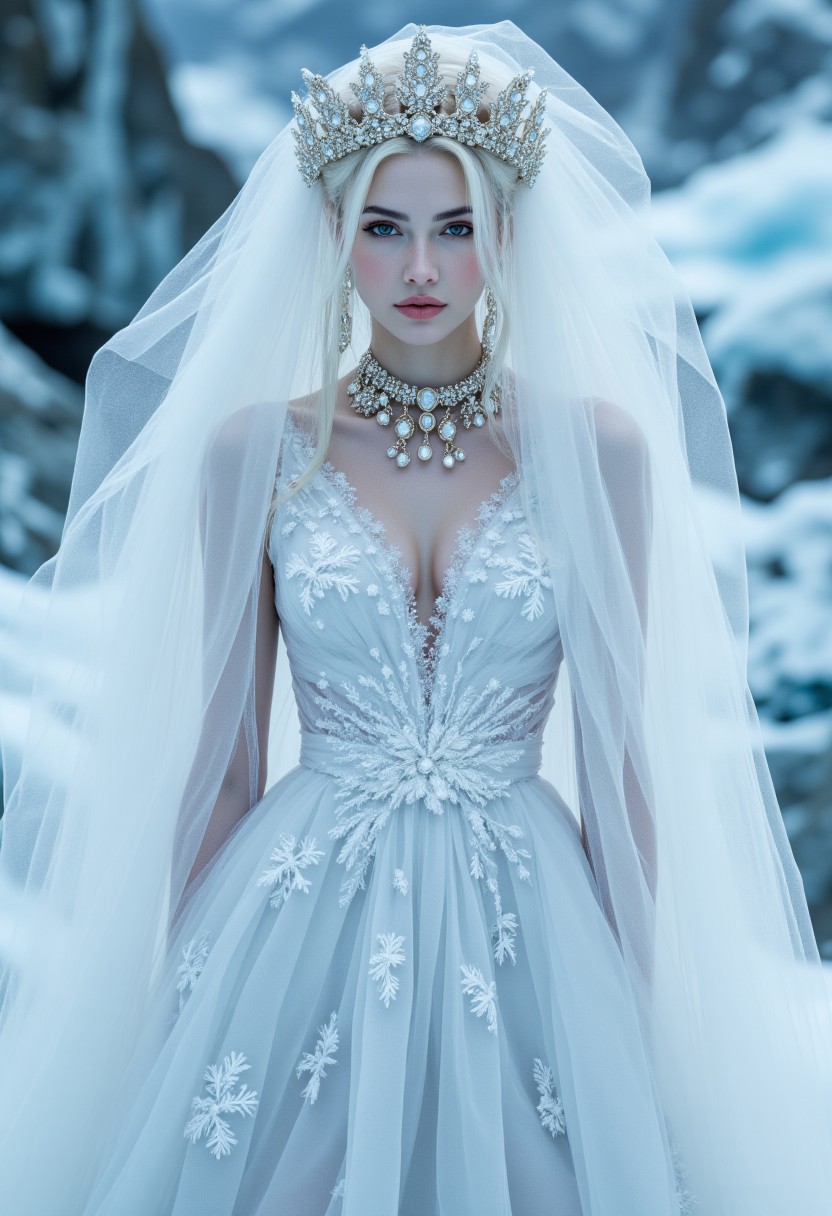 A pale woman with frost-etched skin and sparkling snow-like hair. Her dress of frozen mist and snowflakes clings like a second skin. A crown of icicles and frozen-tear jewelry complete her look. She glides through a glacier ballroom with ice chandeliers casting rainbows. Animated snow sculptures dance around her. , aidmamj6.1, aidmaHyperrealism, aidmafluxpro1.1