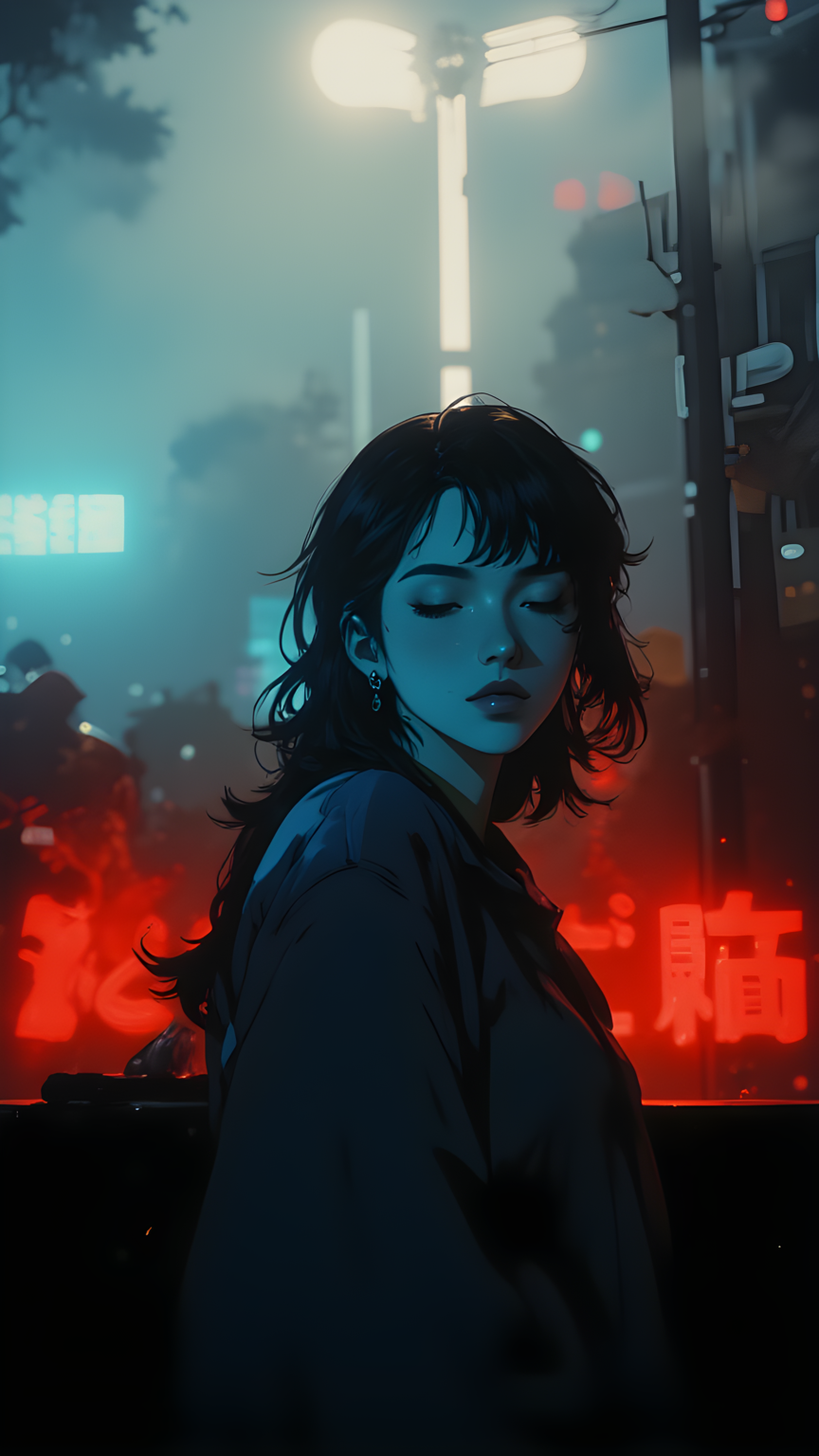 The scene is a vivid interplay of light and shadow, where the subject stands as a figure of quiet intensity against a backdrop of contrasting hues. The lighting is dramatic, with cool blue tones illuminating her face and hair from above, casting an ethereal glow that highlights her features while leaving much to the imagination. Her dark hair flows loosely around her shoulders, some strands caught by the breeze, adding a sense of movement and life to the otherwise still image. Her expression is serene yet enigmatic, her eyes closed as though she is lost in thought or perhaps savoring a moment of peace. The soft illumination accentuates the contours of her face, giving her skin a smooth, almost translucent quality. A subtle earring catches the light, adding a delicate touch of detail to her appearance. Behind her, the background is a stark contrast of deep reds and oranges, creating a fiery aura that seems to pulse with energy. This vibrant glow appears to be emanating from neon lights or illuminated signs, suggesting an urban settingâperhaps a bustling city street at night. The interplay between the cool blues of her face and the warm reds behind her creates a striking visual tension, drawing the viewer's eye back and forth between the two elements. The overall atmosphere is one of mystery and intrigue. The subjectâs calm demeanor contrasts sharply with the dynamic, almost chaotic energy of the background, creating a sense of duality. It feels as though she exists in a liminal space, suspended between the serenity of her own world and the vibrant chaos surrounding her. The image evokes a feeling of quiet strength and resilience, as if she is unafraid to navigate the complexities of this vivid, contradictory environment., <lora:FLUX\jul\J_Anime:0.7>, <lora:FLUX\RealAnime:0.7>