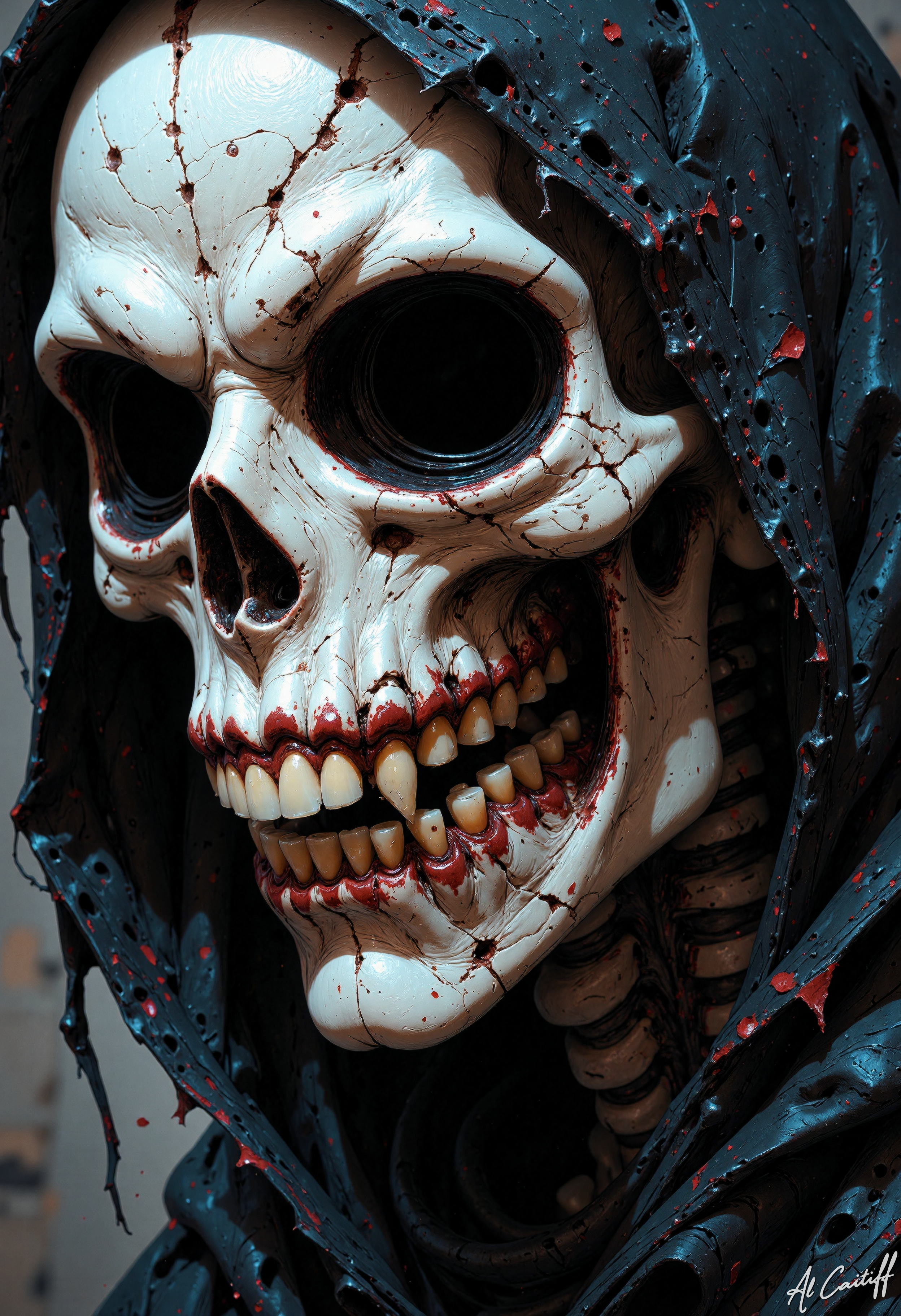 A close-up of a person's face with a grotesque, nightmarish appearance. The face is a skull-like mask with a cracked and weathered white surface, resembling a zombie's face. The eyes are two dark, empty voids that seem to be sucking in the light around them, giving an unsettling and unnatural gaze. The mouth is a wide, toothy grin with jagged, yellowed teeth that seem to be constantly gnawing on something. The skin around the mouth is cracked and dry, with dark cracks that resemble a spider's web. The face is hooded, with a black hood pulled up over it, casting deep shadows that make the face seem even more sinister. The hood is tattered and worn, with frayed threads and a few loose threads hanging off it. The person's neck is long and thin, with a few visible vertebrae that seem to be exposed. The overall effect is one of a macabre, supernatural presence that seems to be lurking just out of sight., MysticComic, comic book style, CreeepyCuteMagic<lora:Flux/creeepycutemagic-000012 - version ER.safetensors:0.5:0.5> <lora:CustomFlux/MysticComic.safetensors:0.5000000000000001:0.5000000000000001> <lora:CustomFlux/MysticFantasy.safetensors:0.15000000000000002:0.15000000000000002>